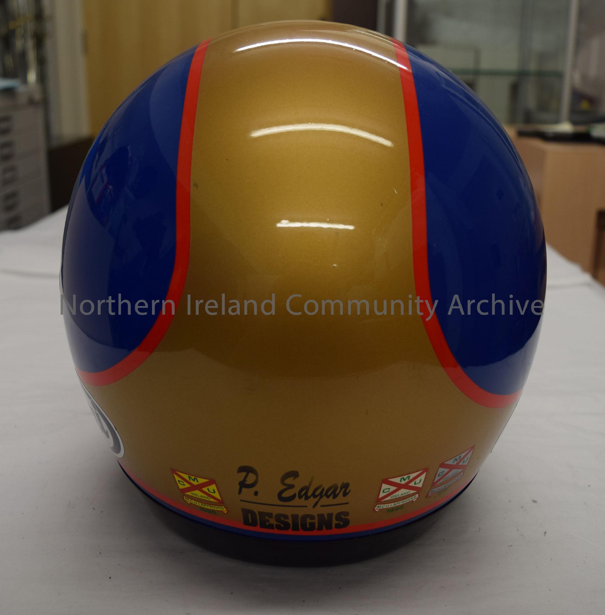 Arai motorcycle helmet belonging to R. J. Hazleton. Blue helmet with a gold stripe that runs down the middle and around the bottom with a red trim. R … – 2016.93 (4)