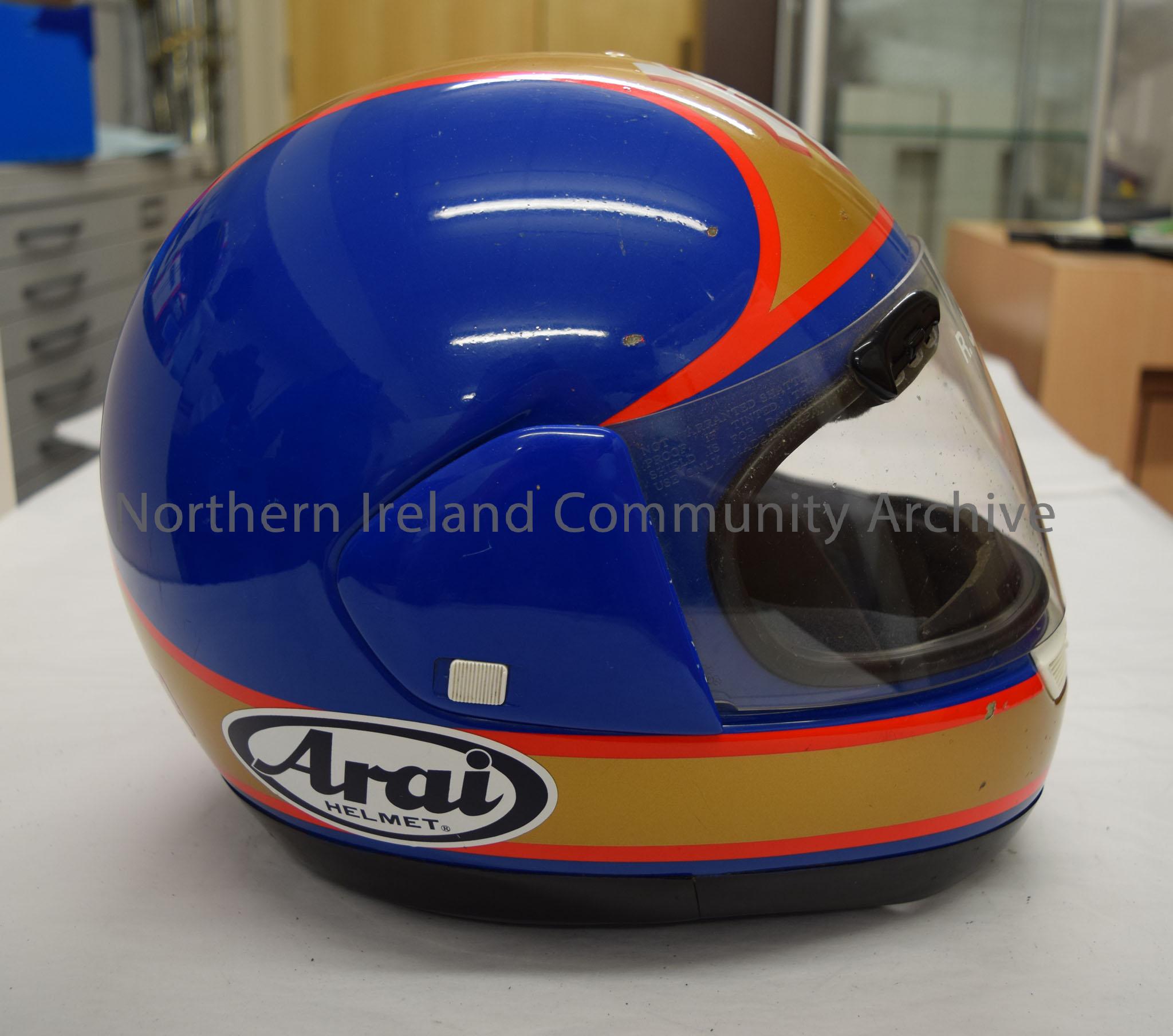 Arai motorcycle helmet belonging to R. J. Hazleton. Blue helmet with a gold stripe that runs down the middle and around the bottom with a red trim. R … – 2016.93 (5)