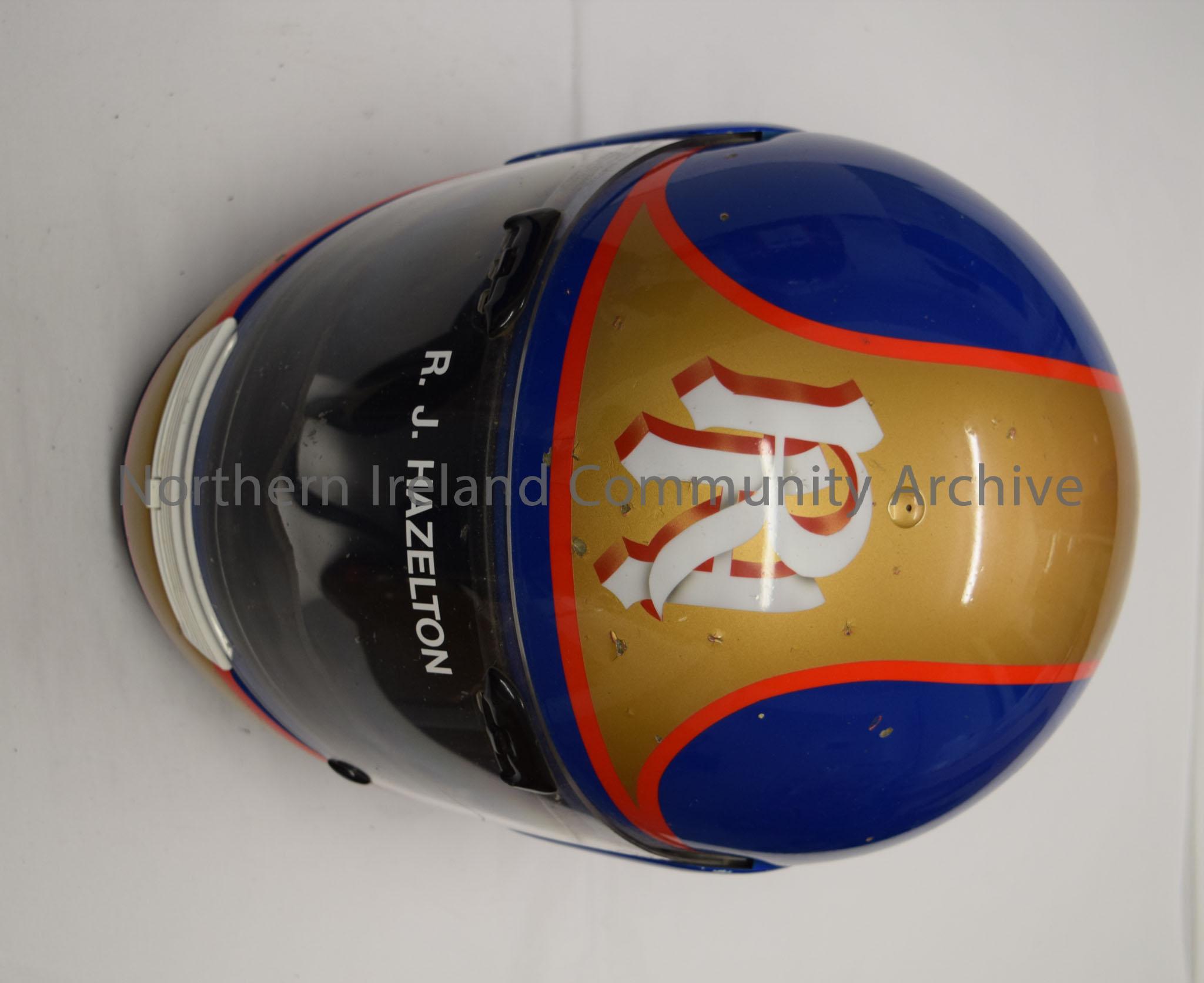 Arai motorcycle helmet belonging to R. J. Hazleton. Blue helmet with a gold stripe that runs down the middle and around the bottom with a red trim. R H in white letters on the front