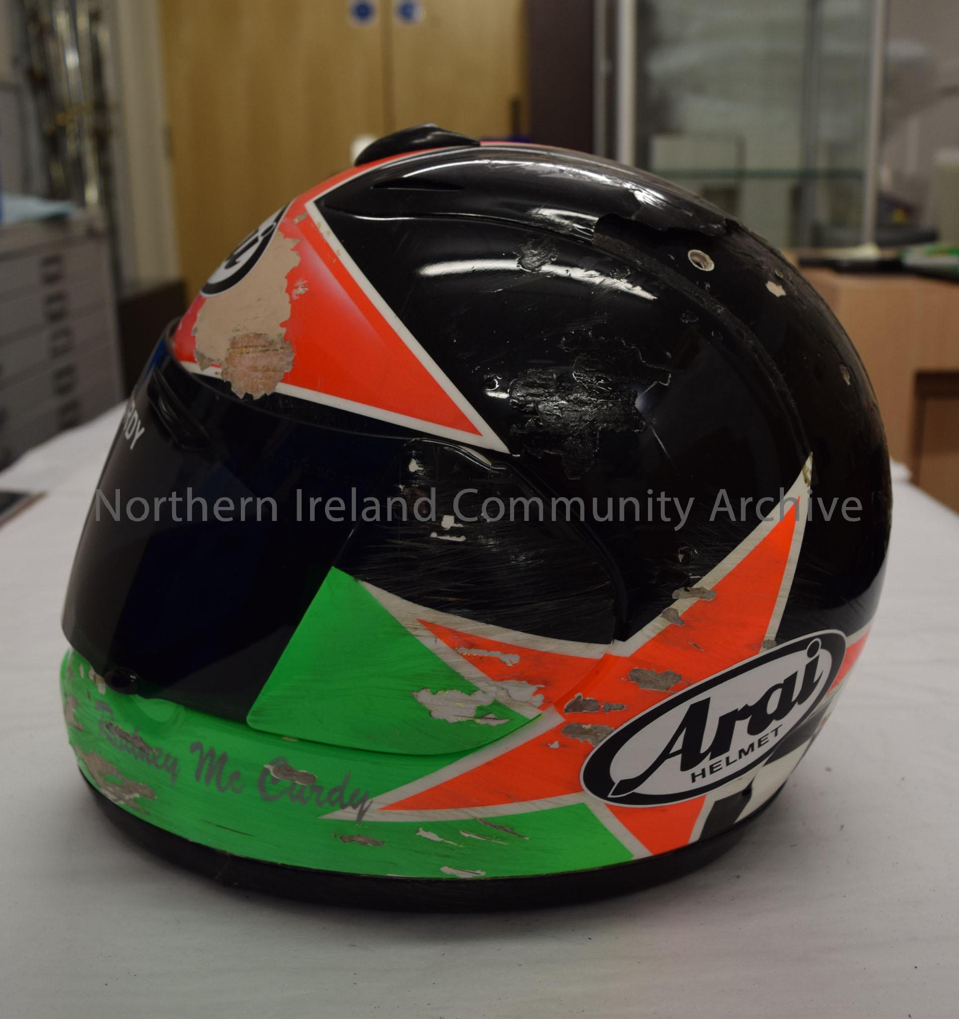 Arai motorcycle helmet belonging to Rodney McCurdy. Black helmet with top of a star in orange at the front and two bright orange stars on the side. Chin bar is bright green.