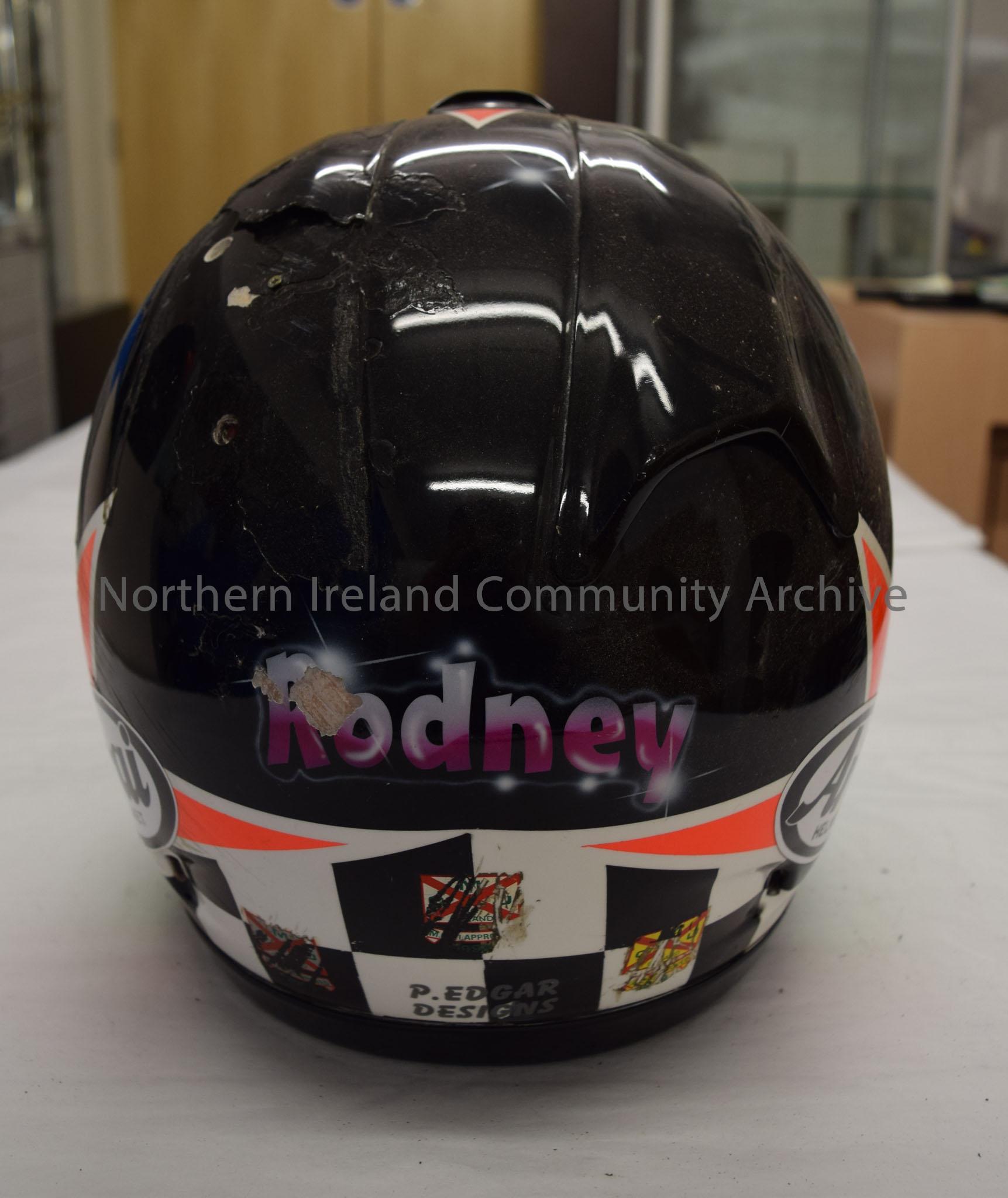 Arai motorcycle helmet belonging to Rodney McCurdy. Black helmet with top of a star in orange at the front and two bright orange stars on the side. Ch… – 2016.97 (4)