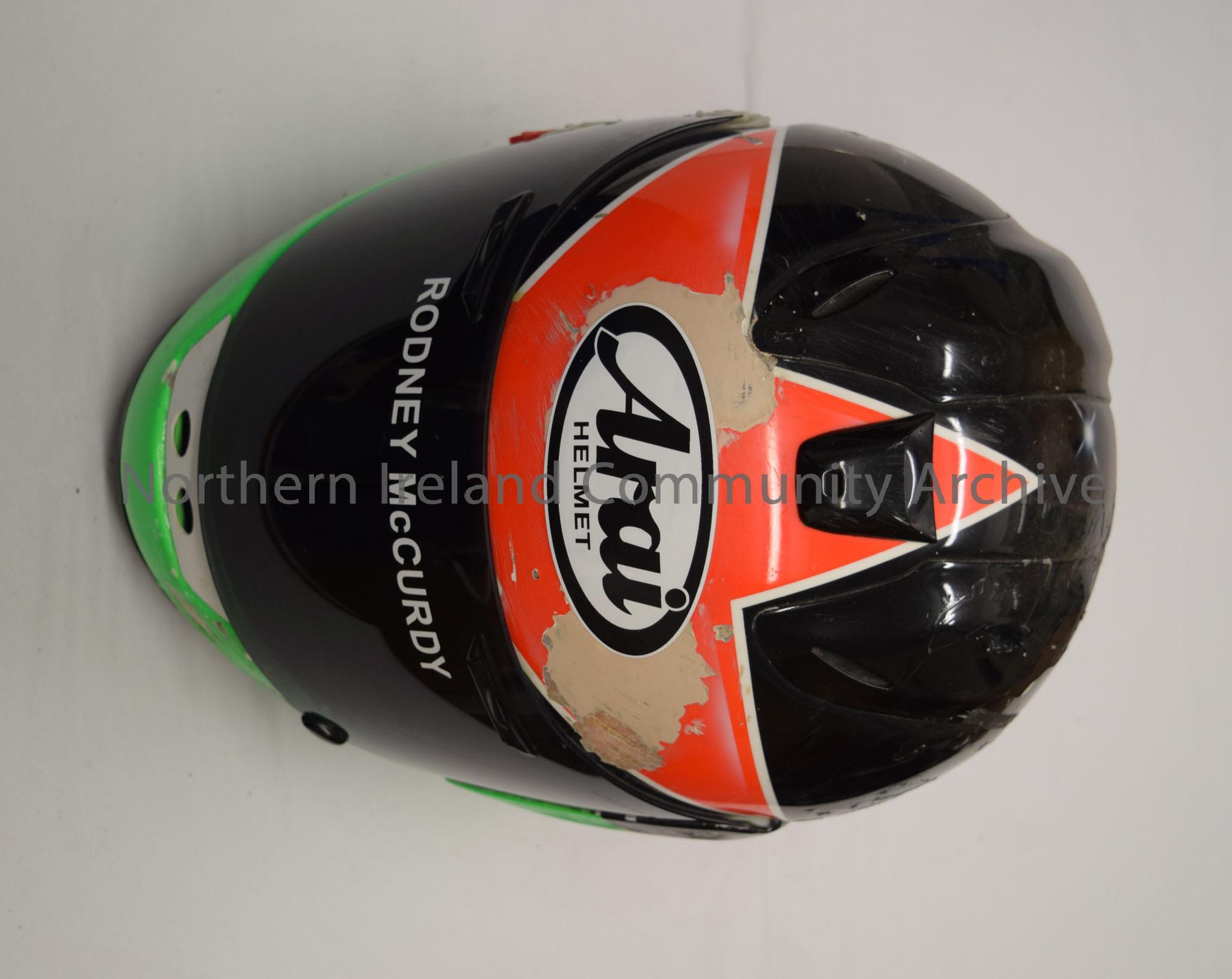Arai motorcycle helmet belonging to Rodney McCurdy. Black helmet with top of a star in orange at the front and two bright orange stars on the side. Chin bar is bright green.