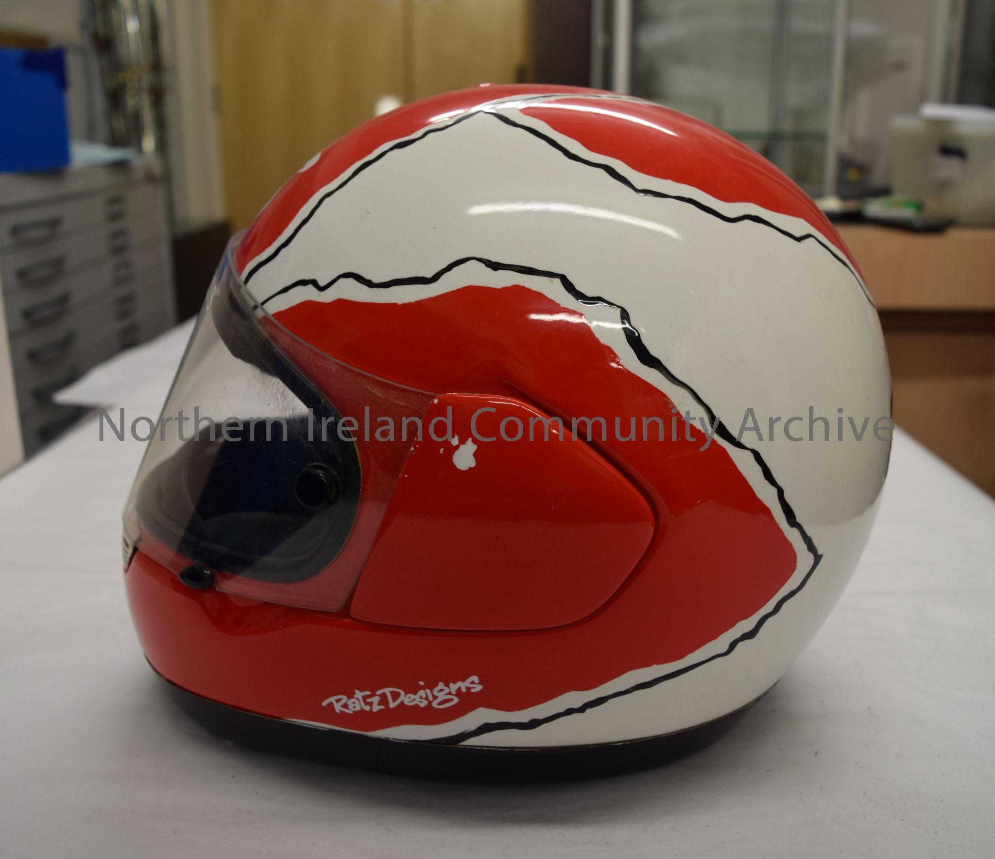 Arai motorcycle helmet belonging to Ronnie Shields. Red and white pattern with thin black lines between and an image of the cartoon character Road Run… – 2016.104 (3)