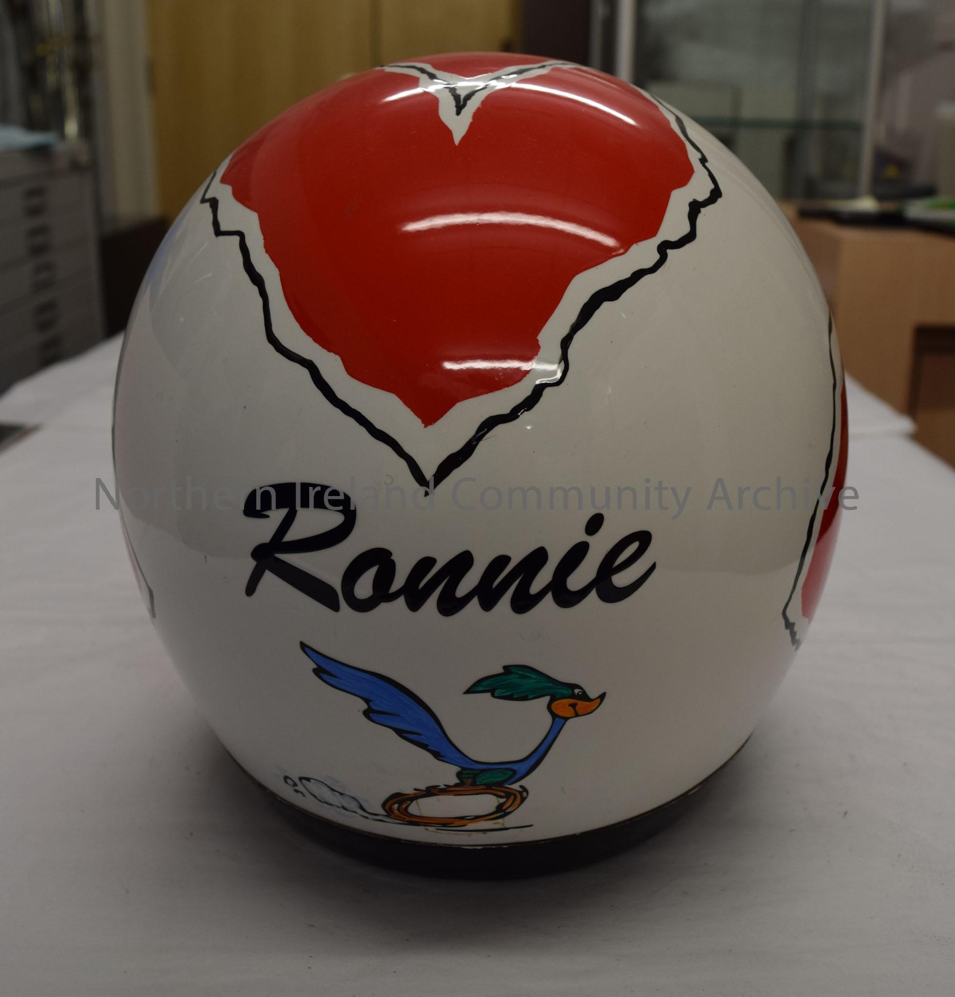 Arai motorcycle helmet belonging to Ronnie Shields. Red and white pattern with thin black lines between and an image of the cartoon character Road Run… – 2016.104 (4)