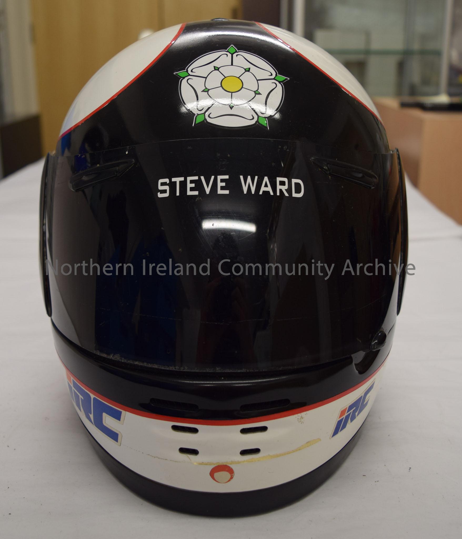 Arai motorcycle helmet belonging to Steve Ward. White helmet with a black pattern with red trim. Image of a white five leafed flower with a yellow centre on the front.