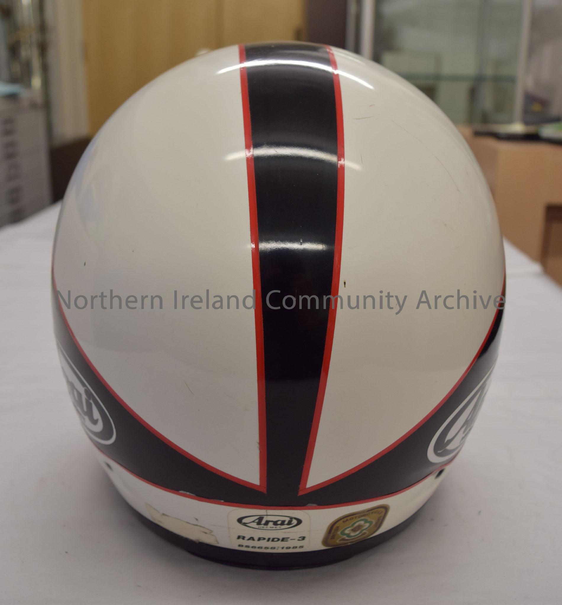 Arai motorcycle helmet belonging to Steve Ward. White helmet with a black pattern with red trim. Image of a white five leafed flower with a yellow cen… – 2016.90 (4)