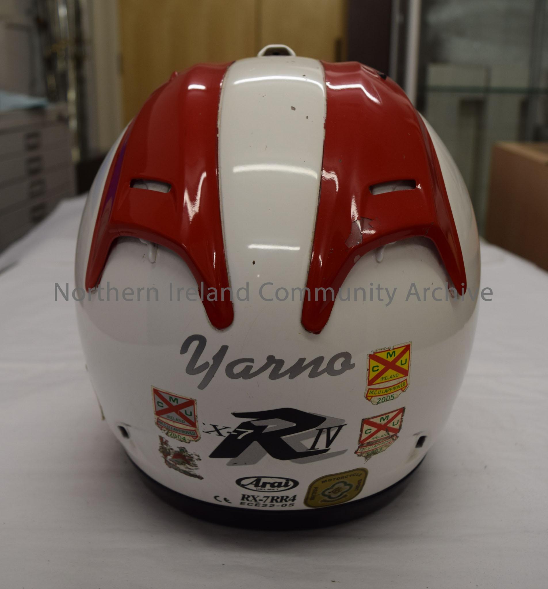 Arai motorcycle helmet belonging to Yarno Holland. White with red vents on the top – 2016.3 (4)