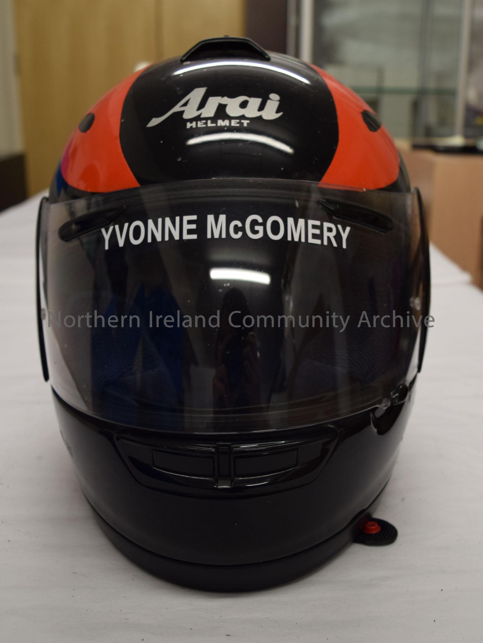 Arai motorcycle helmet belonging to Yvonne Montgomery. Black helmet with a red flame like pattern along the top and an image of the cartoon character … – 2016.98 (2)