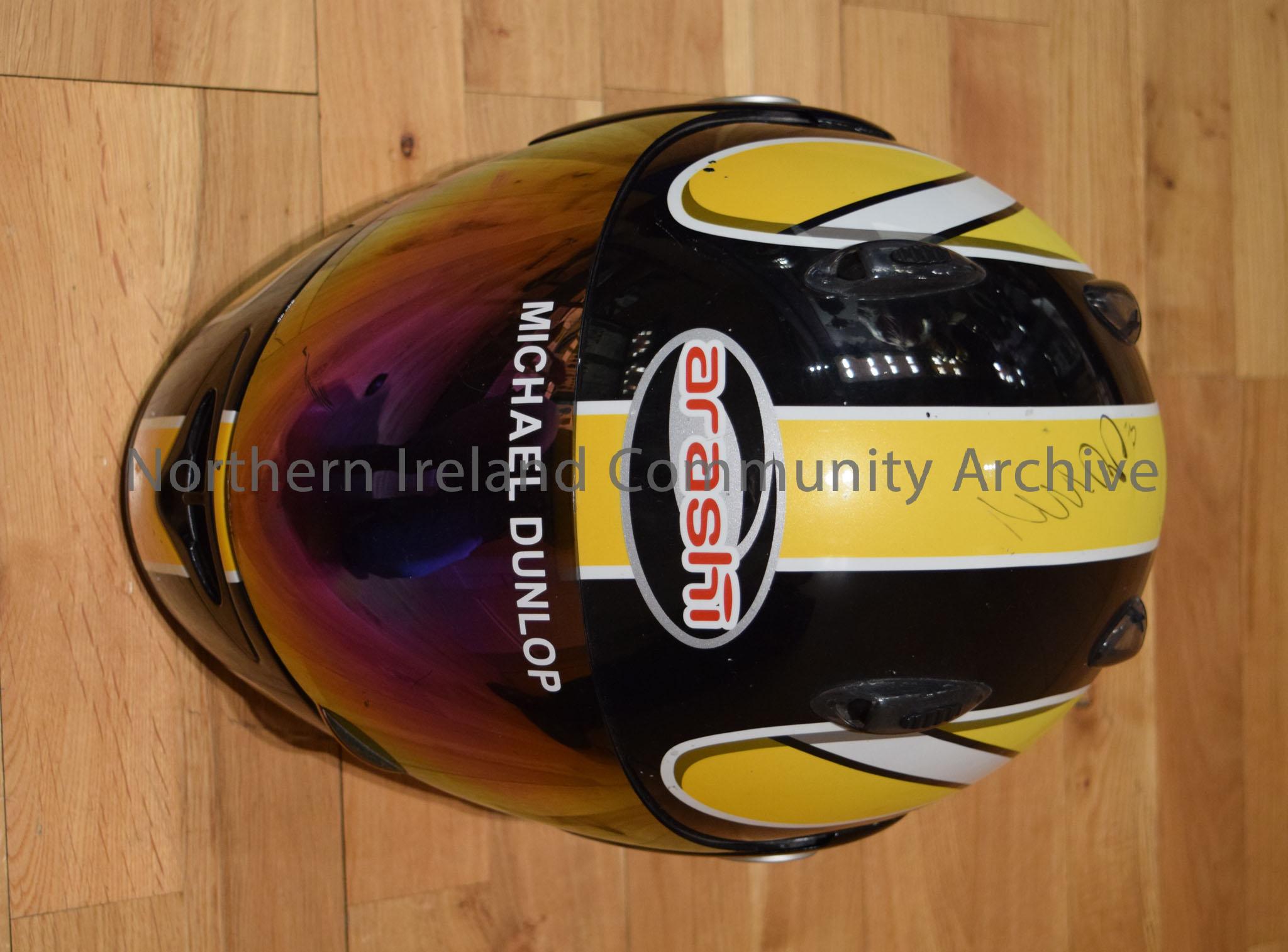 Arashi motorcycle helmet belonging to Michael Dunlop. Black, yellow and white striped helmet.