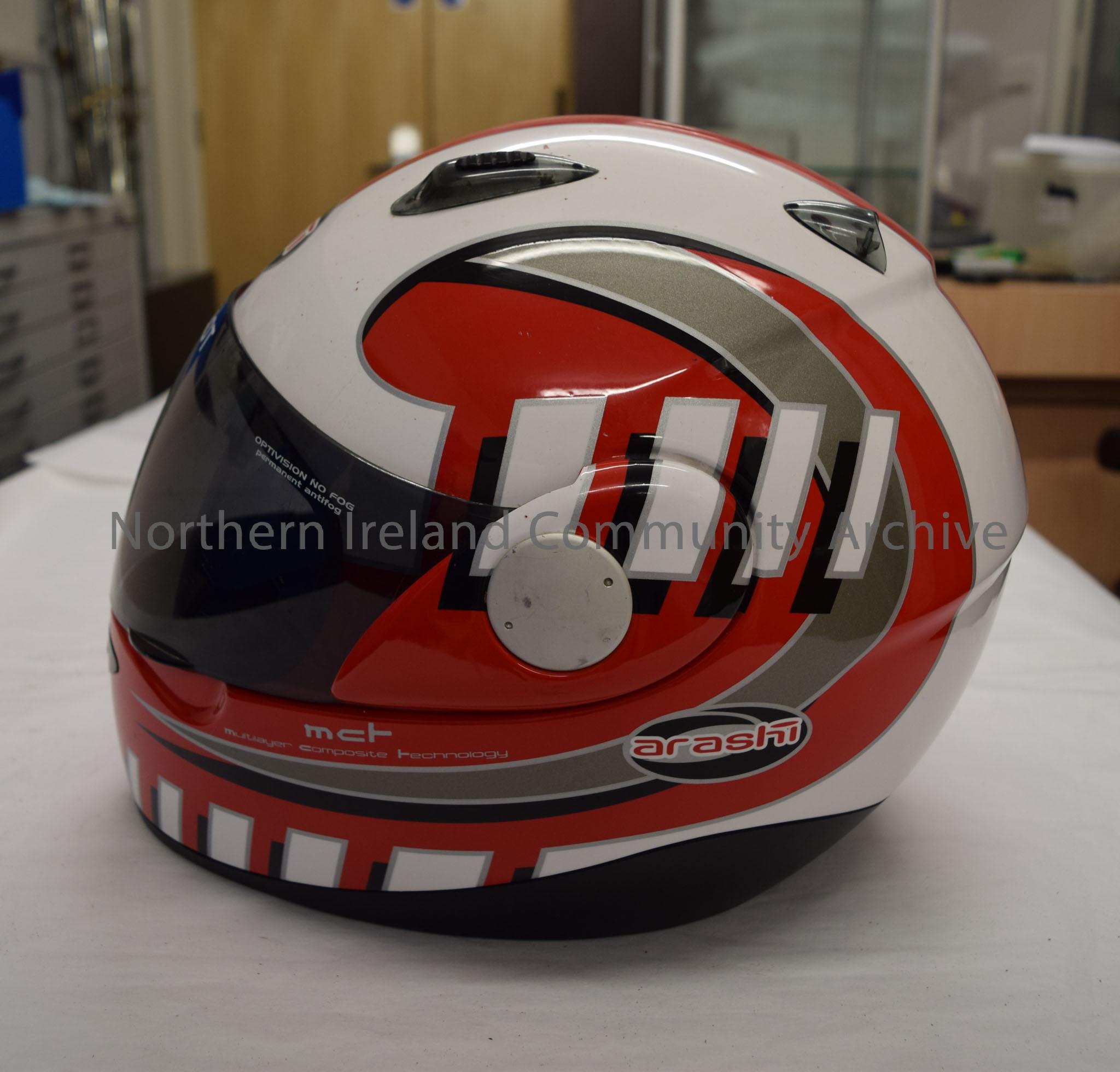 Arashi motorcycle helmet belonging to Seamus Elliot. Red and white striped helmet with red sides and four white rectangles with a silver border and a … – 2016.57 (3)