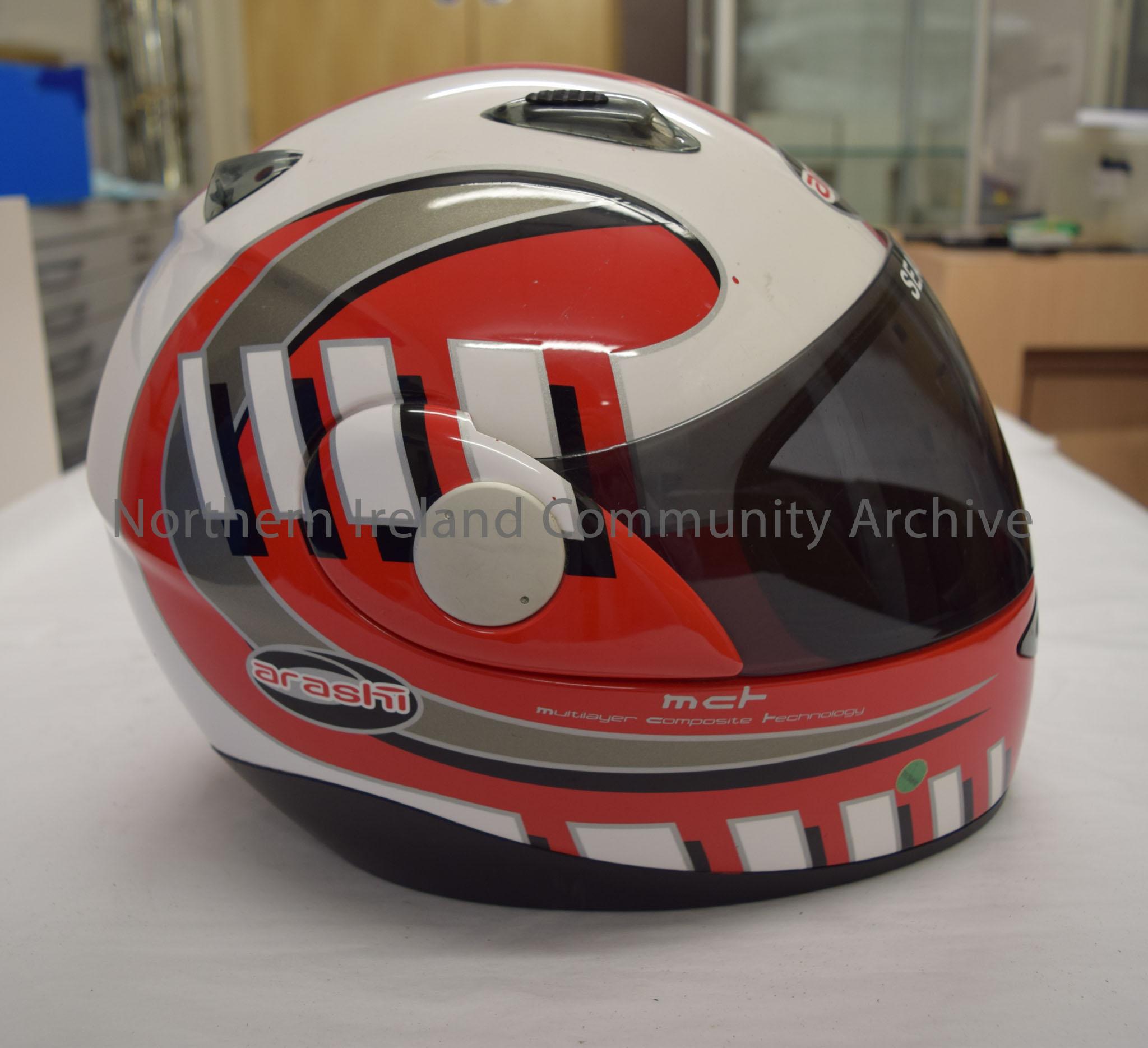 Arashi motorcycle helmet belonging to Seamus Elliot. Red and white striped helmet with red sides and four white rectangles with a silver border and a … – 2016.57 (5)