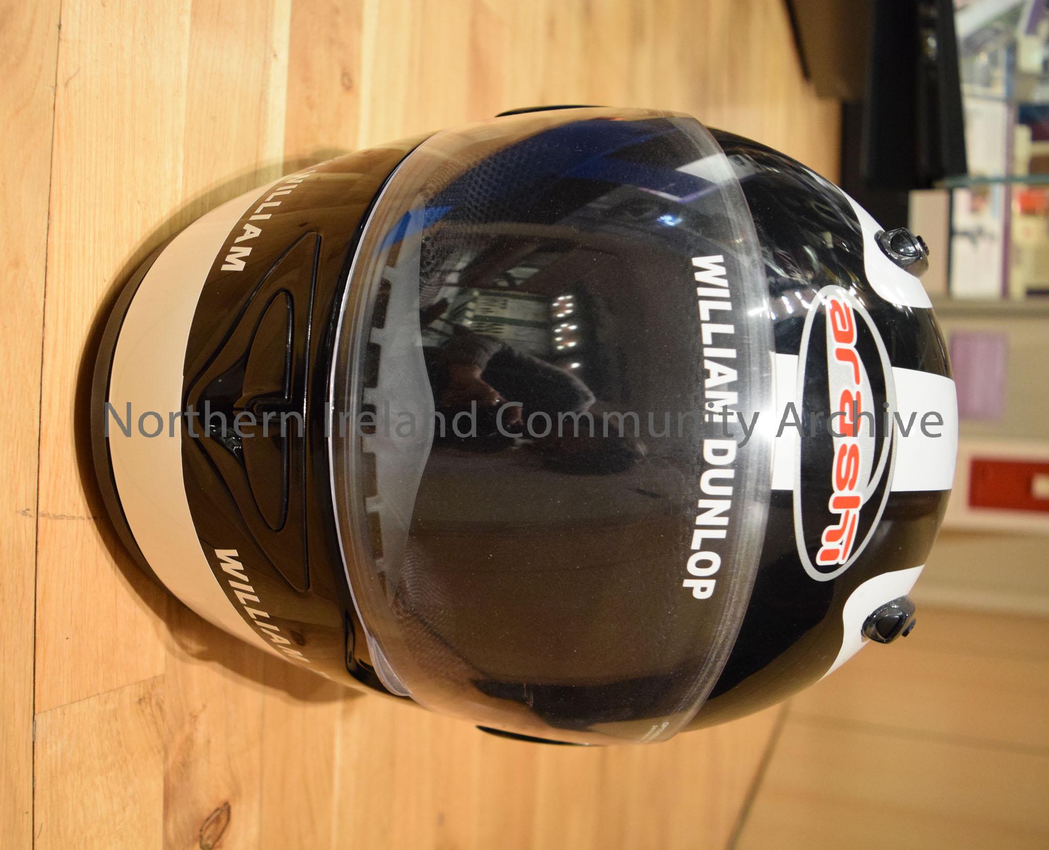 Arashi motorcycle helmet belonging to William Dunlop. Black with white stripe down the middle and two white triangular segments down each side.