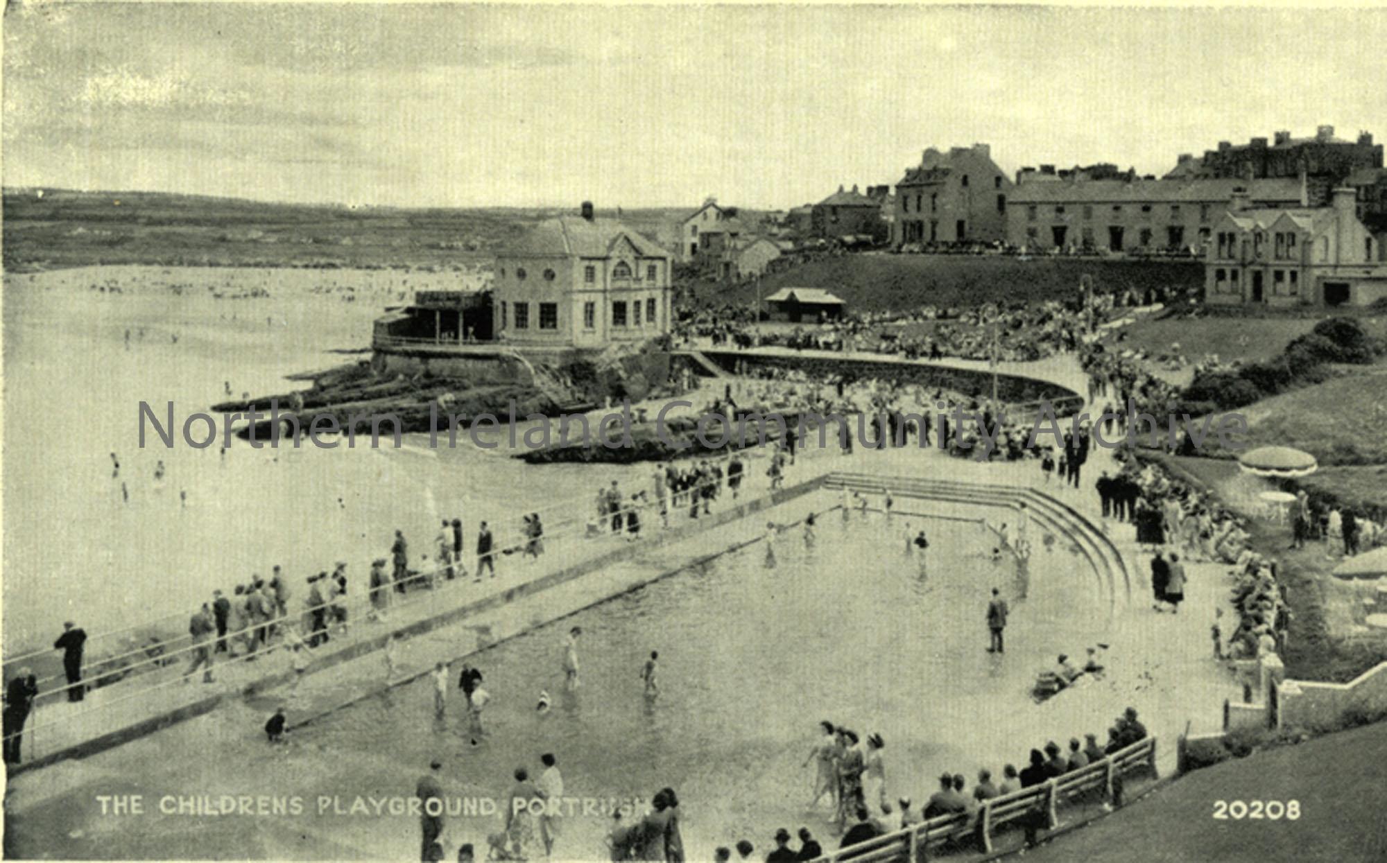 Postcard titled, 'The Childrens Playground, Portrush.' depicting the Arcadia and beach, Portrush.
