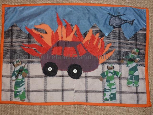 By Sandra Pendon, 2013. This arpillera depicts a scene from The Troubles - a vehicle in flames surrounded by soldiers with an army helicopter hovering overhead. Courtesy of Causeway Museum Service.