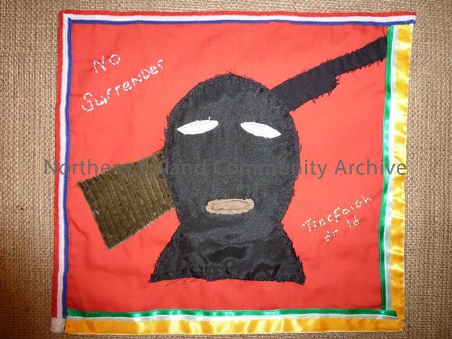 By Michele Connor, Fab Femmes, Ballymoney, 2013. Red background with a balaclava covered face, framed by a gun - half of the arpillera is bordered by the Union Jack flag and half by the Tri colour flag. Courtesy of Causeway Museum Service.