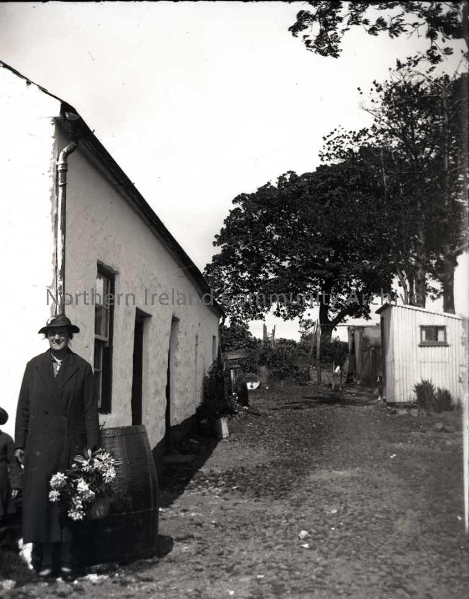 Woman with flowers, small child just out of picture, outside whitewashed cottage - President Chester Arthur's home, Cullybackey. No 34 in Nature Slides inventory