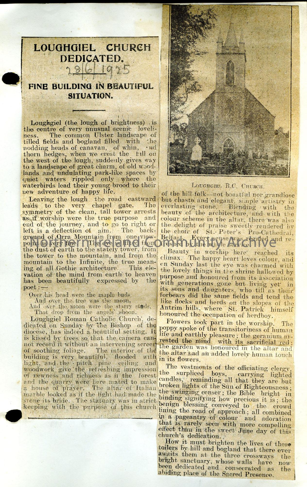 article by Sam Henry titled, ‘Loughgiel Church Dedicated, Fine Building in Beautiful Situation’. Dated 28/6/1925. A description of Loughgiel Roman Cat…