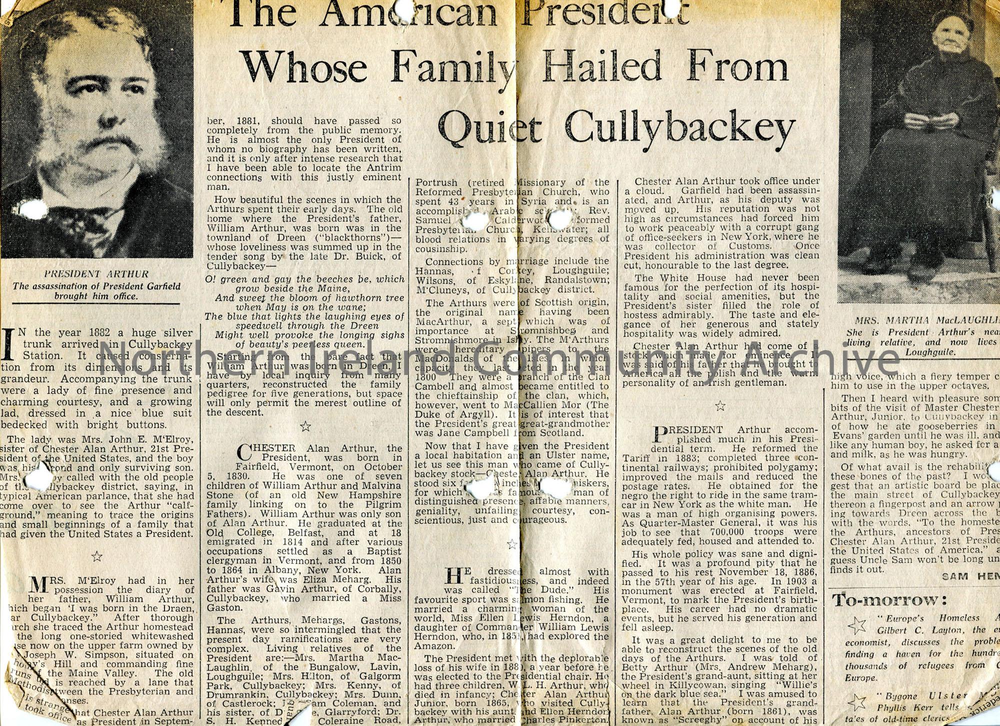 Article by Sam Henry under heading 'The American President Whose Family Hailed From Quiet Cullybackey'. Deals with sister's visit in 1882, Scottish background, local connections, term of presidency. Contains photograph of Chester Arthur and another of a Mrs McLaughlin of Loughguile - 'nearest living relative'
