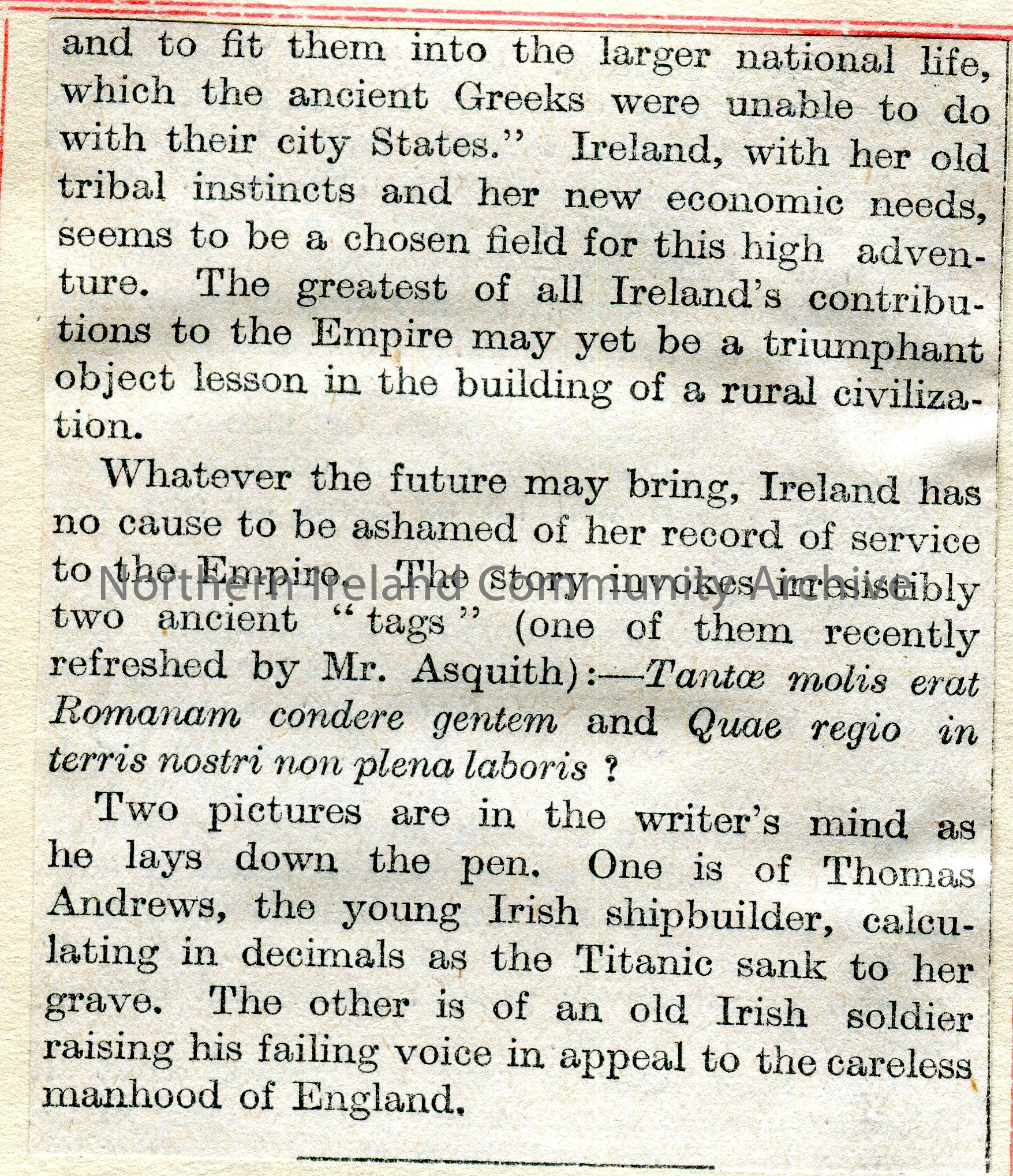 Article cut from a newspaper and pasted to page. Titled, 'Ireland and the Empire. The Share of Irishmen in Empire Building'.
