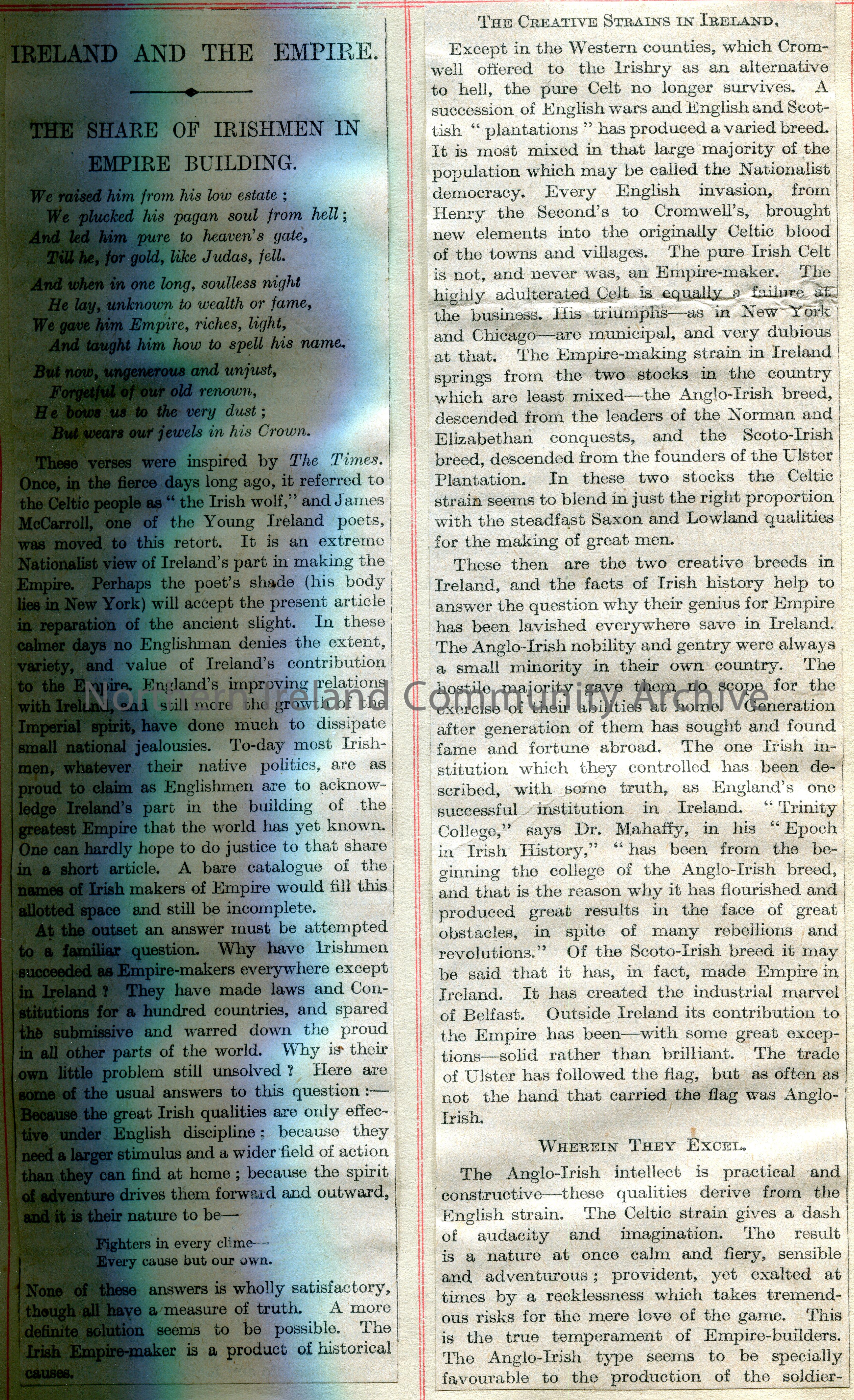 Article cut from a newspaper and pasted to page. Titled, ‘Ireland and the Empire. The Share of Irishmen in Empire Building’.