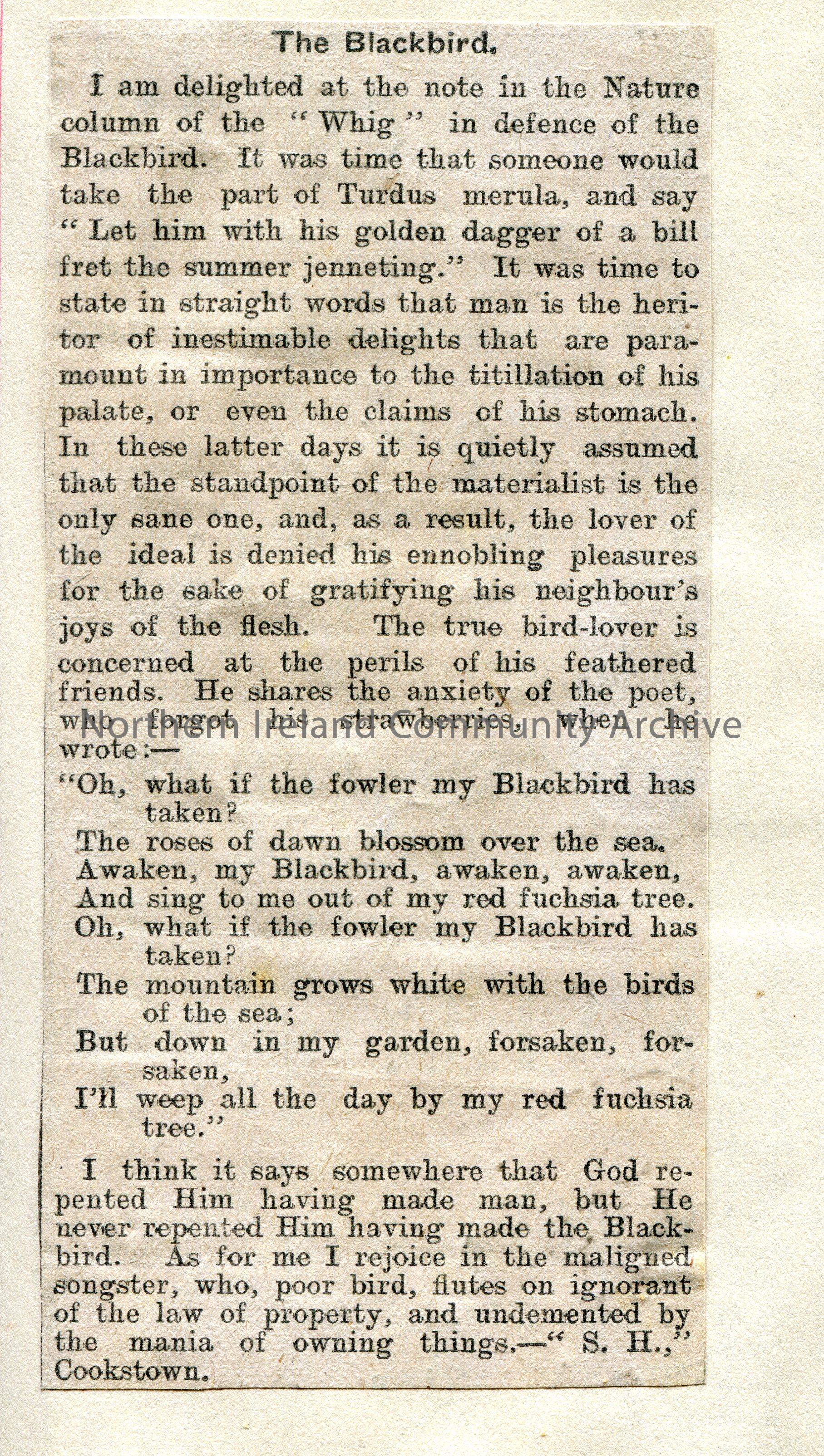 Article cut from a newspaper and pasted to page. Titled, ‘The Blackbird’. Written by Sam Henry, Cookstown.