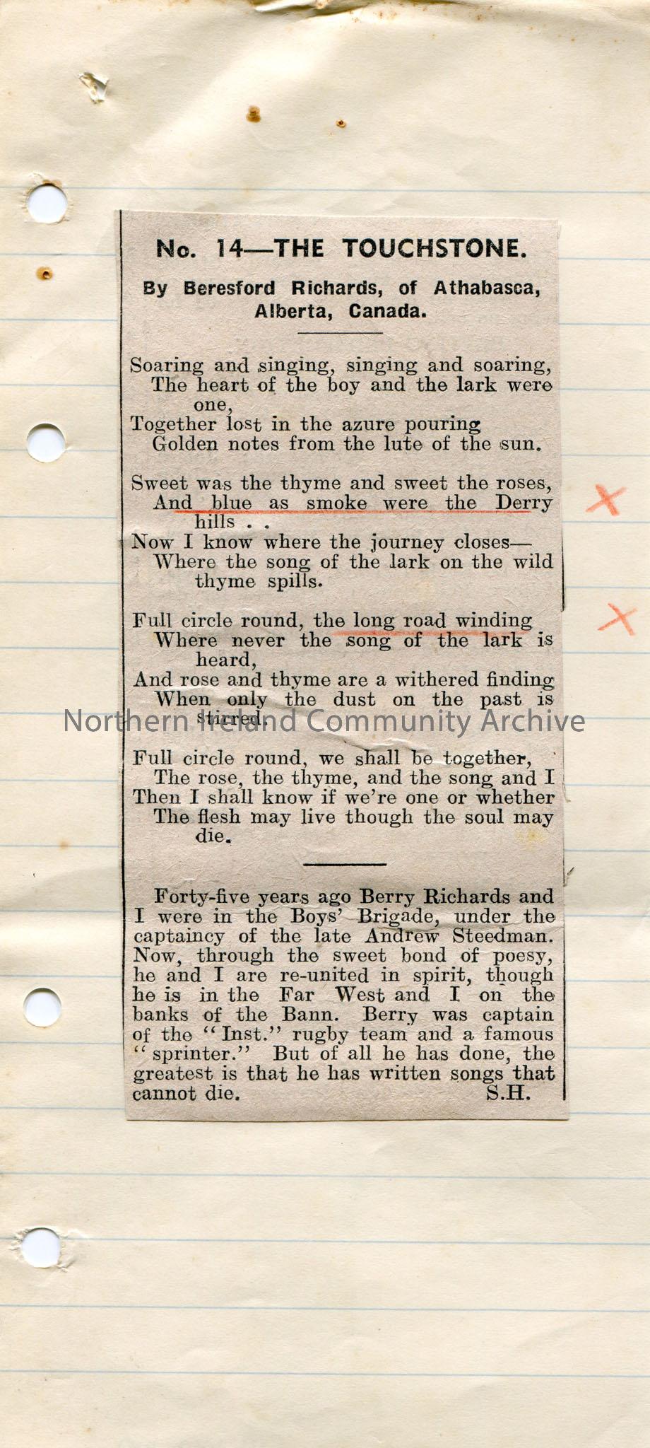 Article cut from a newspaper and stuck to lined page. Poem or words to song titled, 'No. 14 The Touchstone, by Beresford Richards, of Athabasca, Alberta, Canada'. Re the song of the lark. Mentions the Derry hills a blue as smoke. The article is by Sam Henry in which he reminisces about growing up with Berry Richards. They were in the Boys' Brigade; Berry was captain of the 'Inst.' rugby team and a famous 'sprinter'.