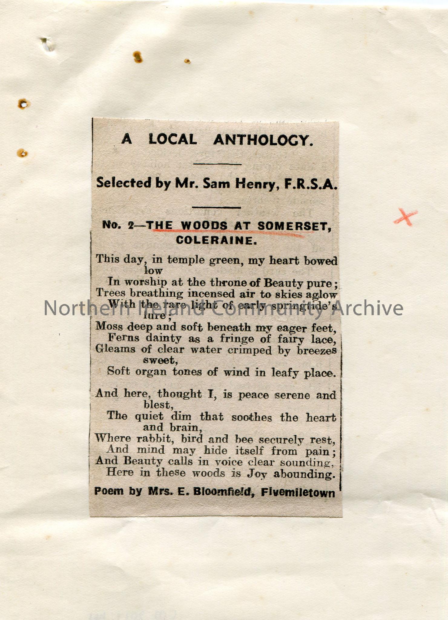 Article cut from a newspaper and stuck to page. Titled 'A Local Anthology. Selected by Mr Sam Henry, F.R.S.A'. Poem titled 'No.2 The Woods at Somerset, Coleraine'. By Mrs E Bloomfield, Fivemiletown.