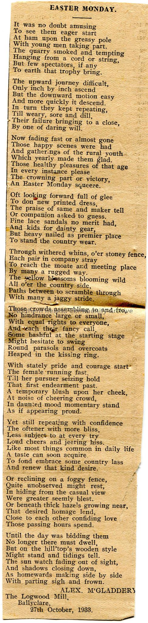 Article cut from a newspaper. Article is of a poem or words to a song titled, 'Easter Monday', by Alex. M'Gladdery, The Logwood Mill, Ballyclare, dated 27th October, 1933.