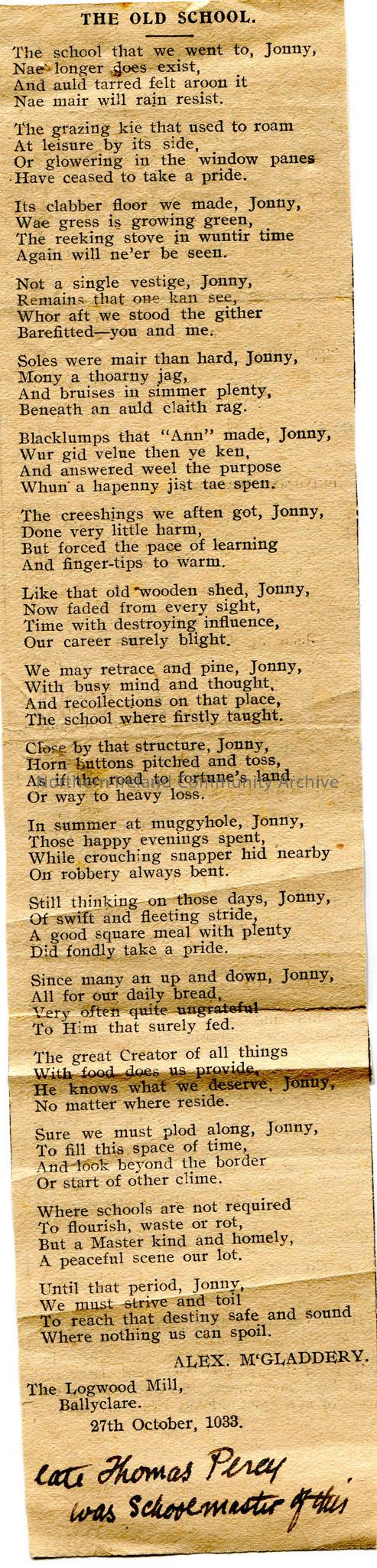 Article cut from a newspaper. Article is of a poem or words to a song titled, 'The Old School', by Alex. M'Gladdery, The Logwood Mill, Ballyclare, dated 27th October, 1933. 'Late Thomas Percy was schoolmaster of this' handwritten in ink at bottom of page.