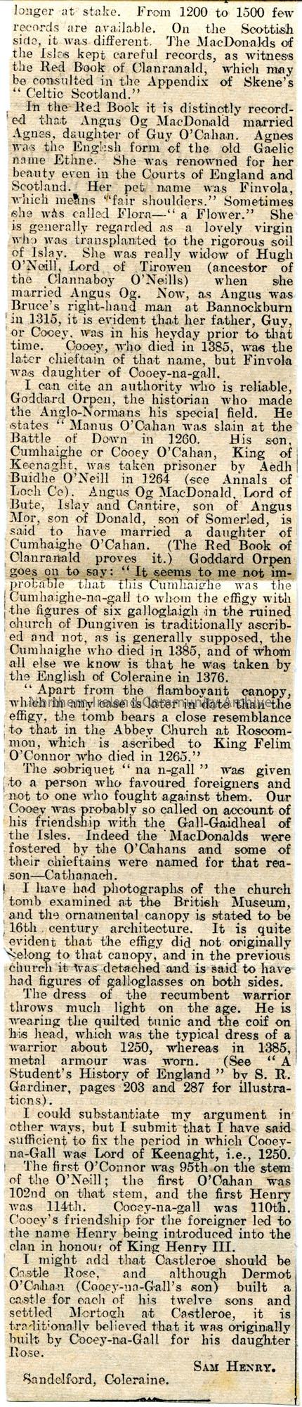 Article cut from a newspaper. Article titled, 'The Great Cooey-na-gall' by Sam Henry. Re tomb of Cooey-na-gall at Dungiven Priory. Refers to Finvola [Gem of the Roe] and her marriage to Angus Og MacDonald.