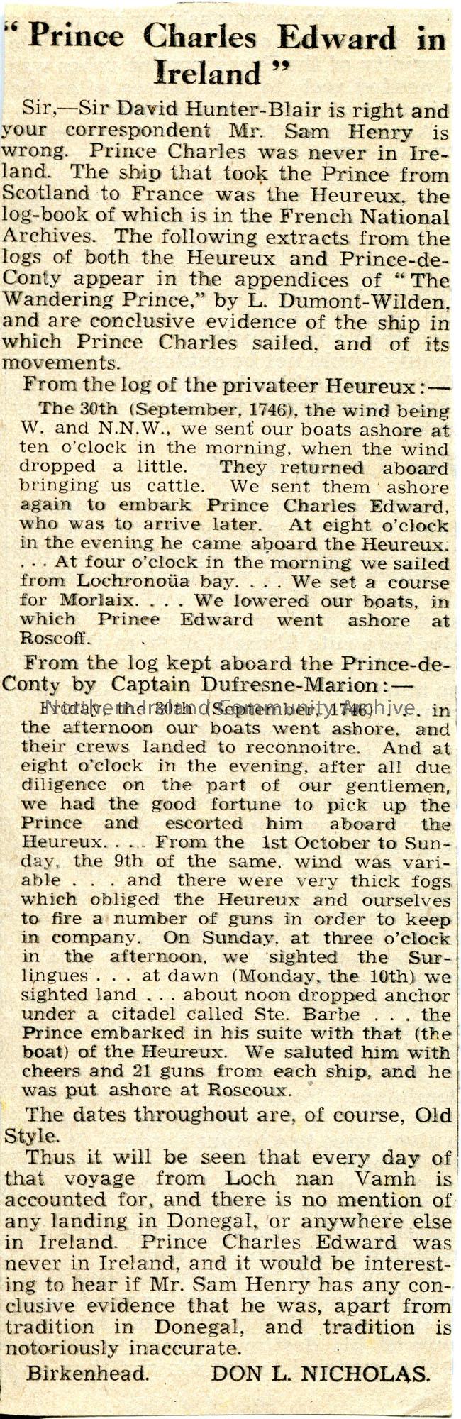 Article cut from a newspaper of a letter. It is from Don L. Nicholas, Birkenhead. The article is titled, 'Prince Charles Edward in Ireland'. Refuting Sam Henry's claim that Prince Charles was in Ireland.
