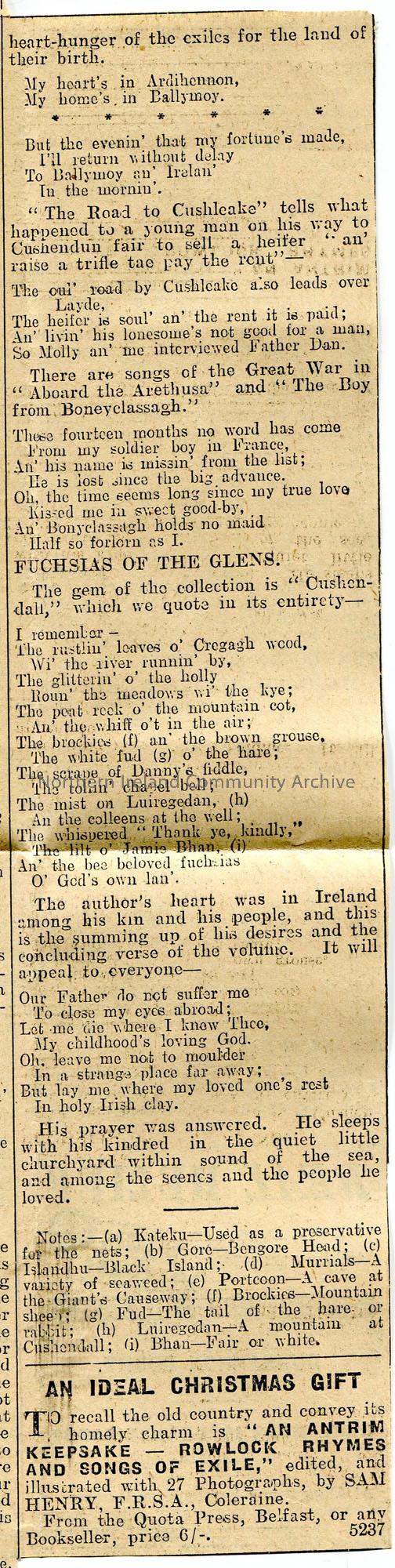 Article cut from a newspaper of a review of a book edited by Sam Henry ‘Rowlock Rhymes and Songs of Exile’. Article titled, ‘Rowlock Rhymes. An Antrim… – scan074d