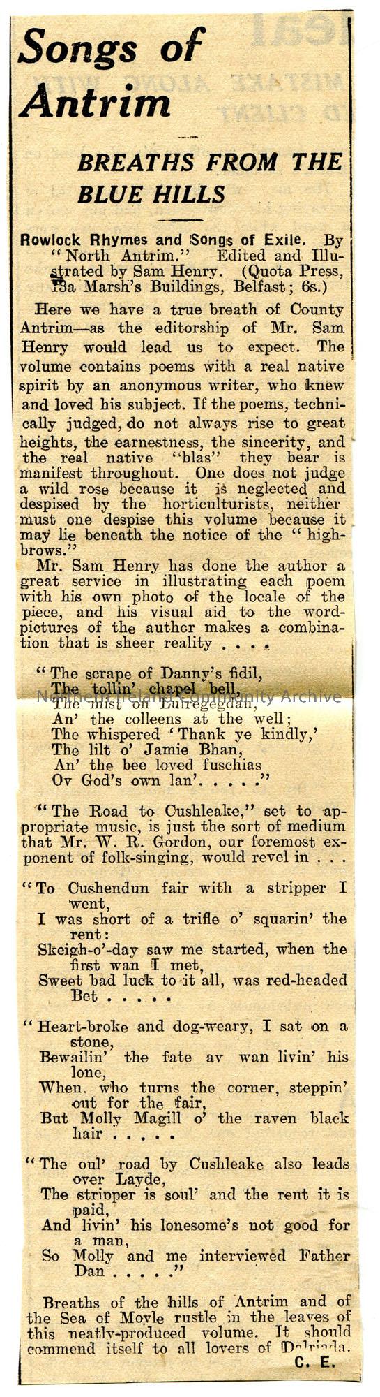 Article cut from a newspaper of a review of a book edited by Sam Henry 'Rowlock Rhymes and Songs of Exile'. Article titled, 'Songs of Antrim. Breaths from the Blue Hills'. Initialled C. E. Refers to the song 'The Road to Cushleake'.