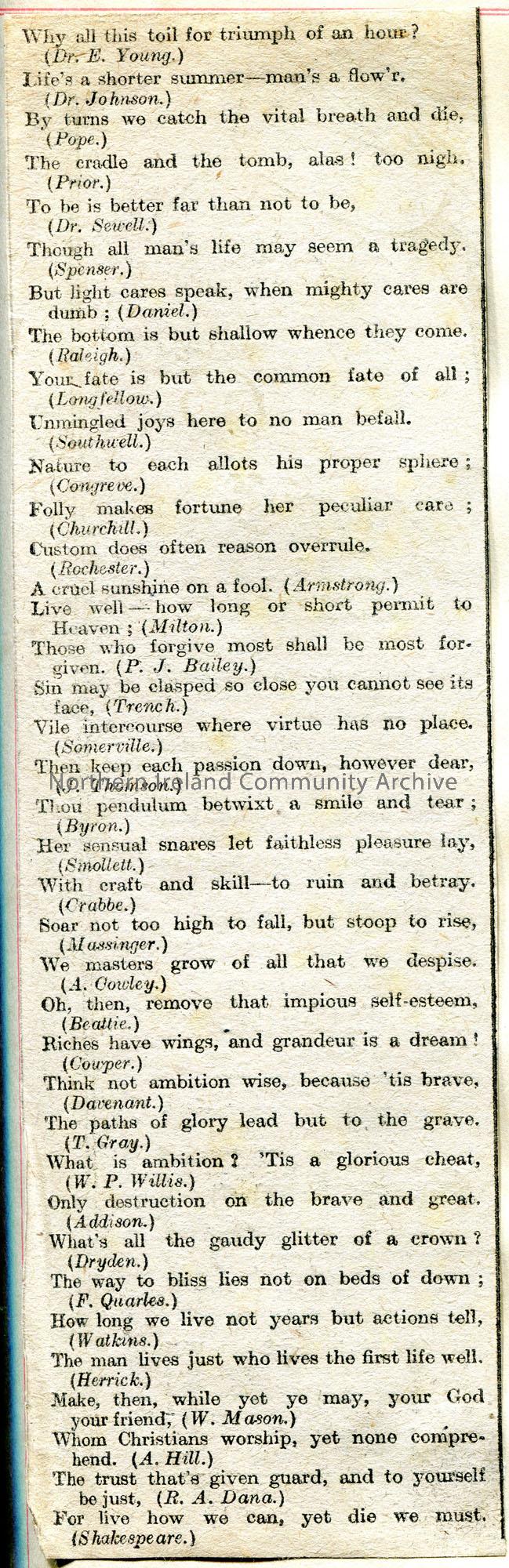 Article cut from a newspaper of well known poets and lines from their poems.