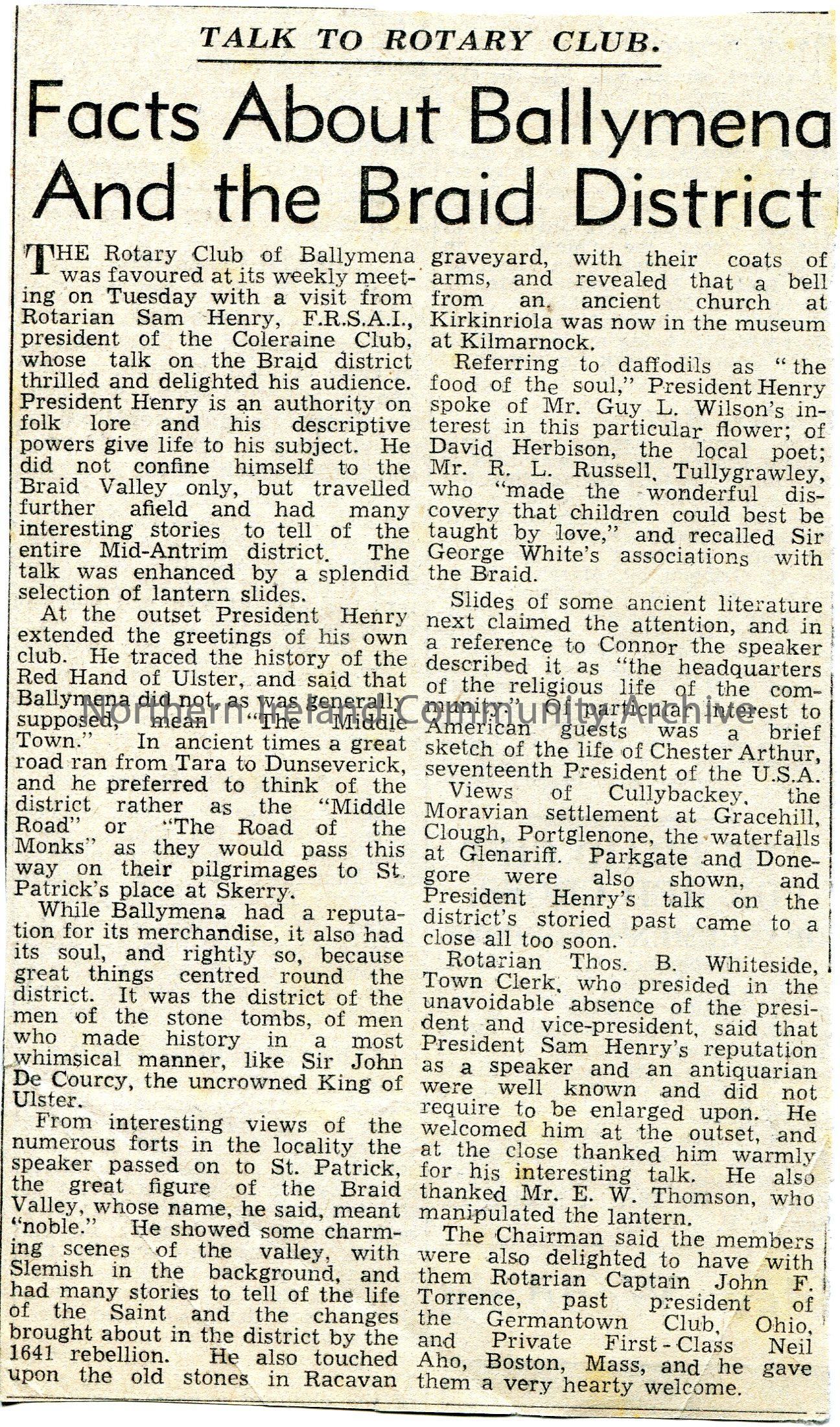Article cut from a newspaper re a talk by Sam Henry to Ballymena Rotary Club. Titled, ‘Facts About Ballymena And the Braid District’. Refers to the me…