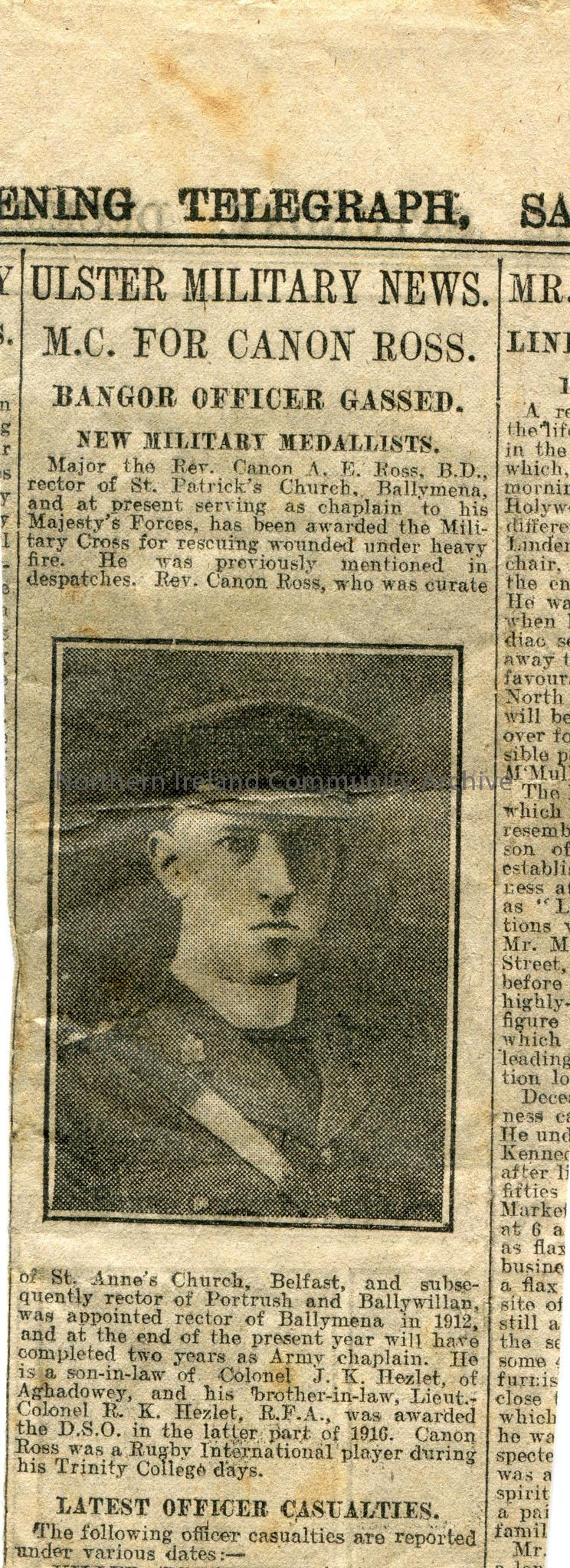 Article cut from a newspaper, the Evening Standard, Saturday, December. Titled, 'Ulster Military News, M.C. For Canon Ross, Bangor Officer Gassed, New Military Medallists'. Major the Rev. Canon A.E. Ross, rector of St.Patrick's Church, Ballymena and who served as chaplain to His Majesty's Forces was awarded the Military Cross for rescuing wounded under heavy fire. He was curate of St.Anne's Church, Belfast and rector of Portrush and Ballymena in 1912. He was son in law of Colonel J.K. Hezlet, Aghadowey and his brother in law, Lieutenant Colonel R.K. Hezlet.