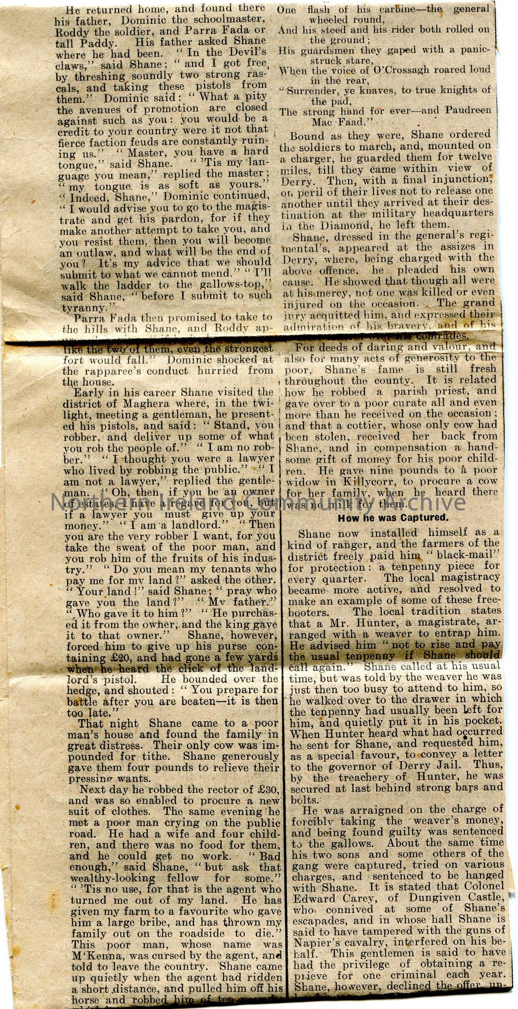 Article cut from a newspaper titled, ‘A Noted County Derry Highwayman. Shane Crossagh’. Article describes the adventures of the leader of a party of r… – scan044b