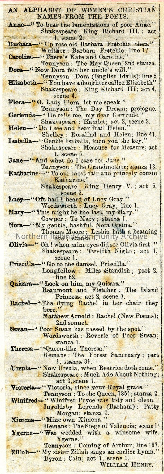 Article cut from a newspaper titled, ‘An Alphabet of Women’s Christian Names From The Poets’. By William Henry.