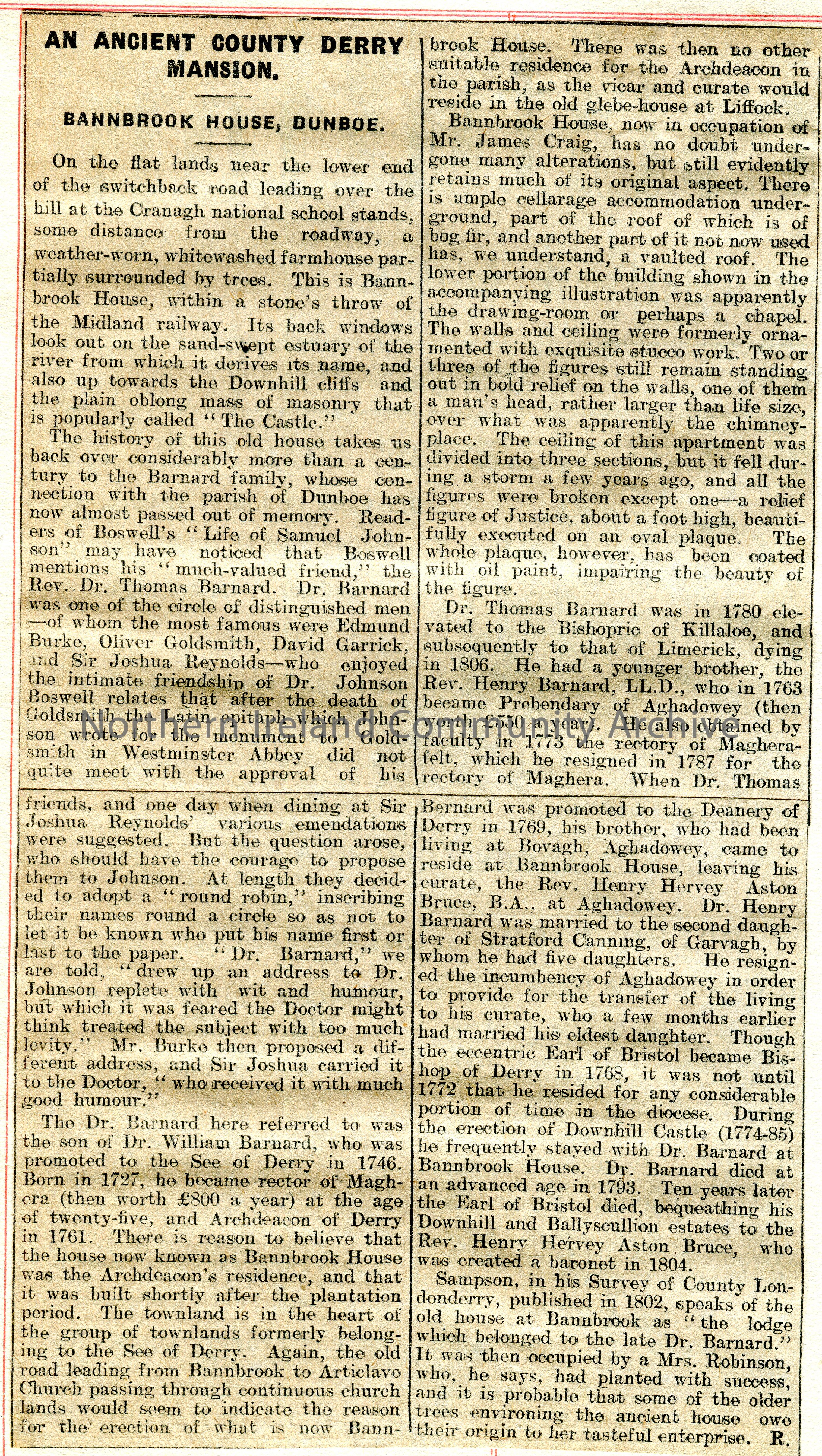 Article cut from a newspaper titled, ‘An Ancient County Derry Mansion. Bannbrook House, Dunboe’.