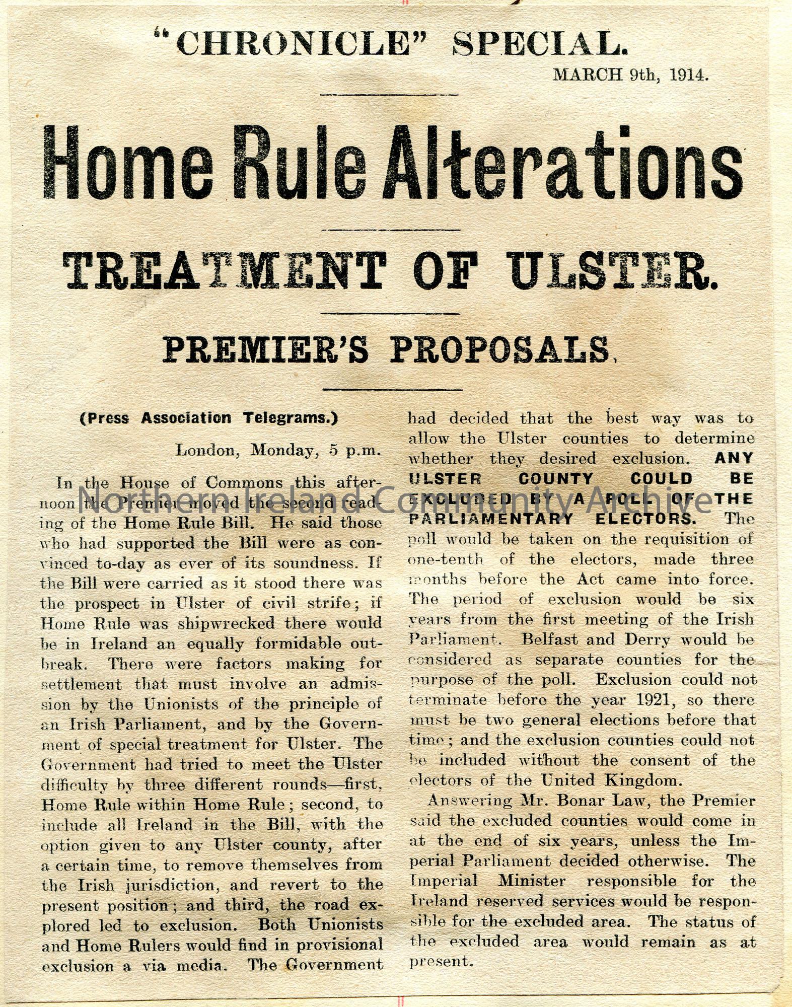 Article cut from a newspaper. Titled, ‘Chronicle Special. Home Rule Alterations. Treatment of Ulster. Premier’s Proposals’. Re Home Rule Bill in Ulste…