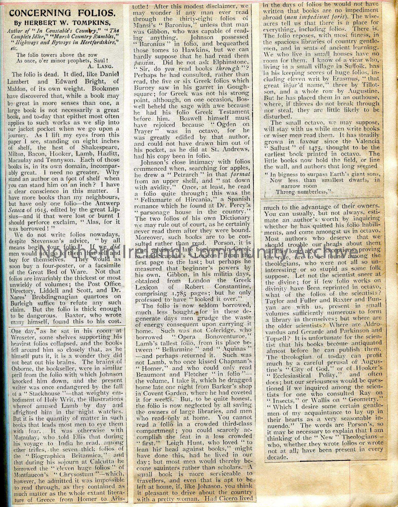 Article cut from a newspaper. Titled, ‘Concerning Folios’ by Herbert W. Tumpkins. Arguing for the use of books rather than folios.