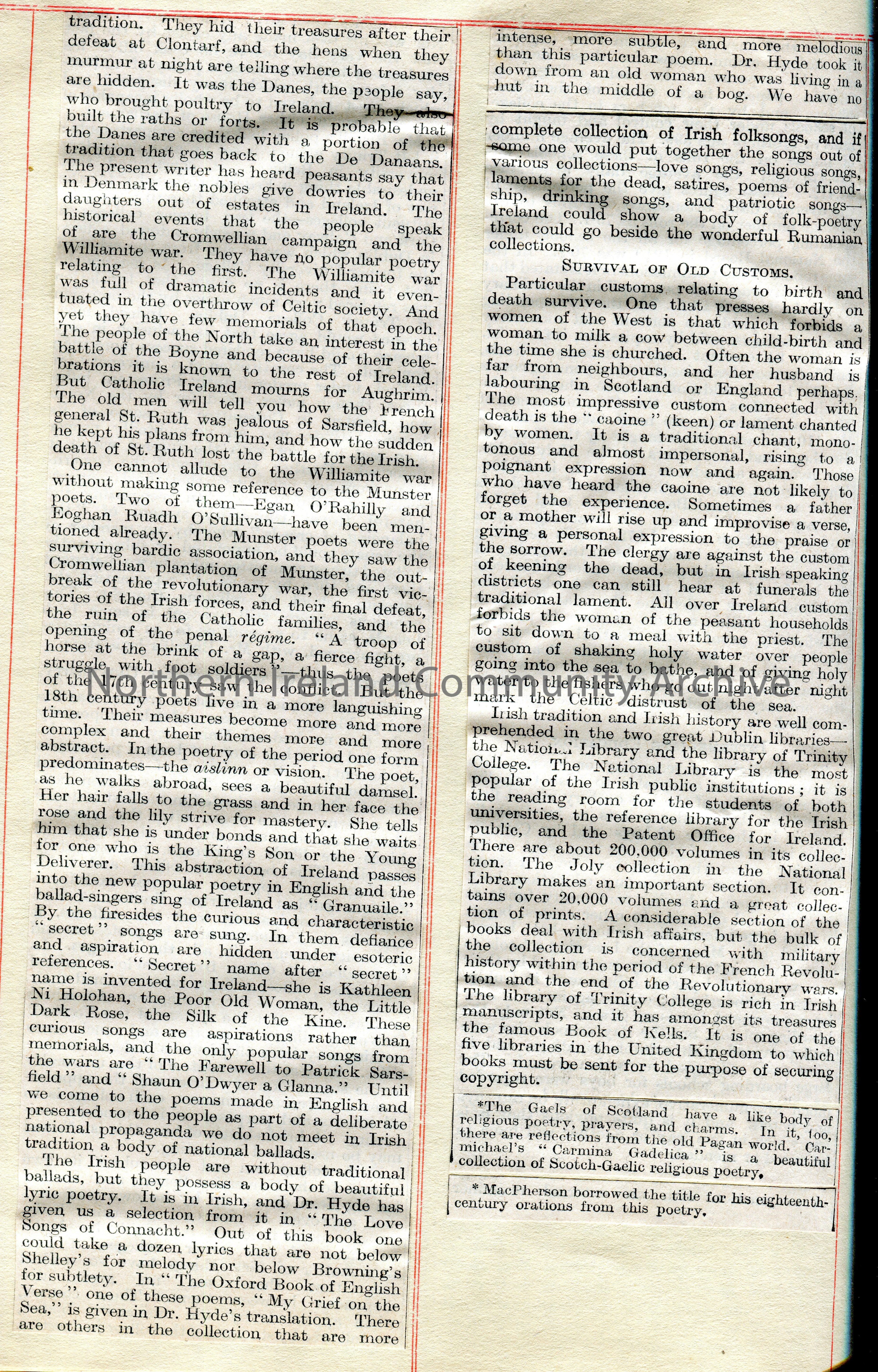 Article cut from a newspaper titled, ‘Irish Folklore. Religious and Historical Conceptions and Customs.’ – scan006c