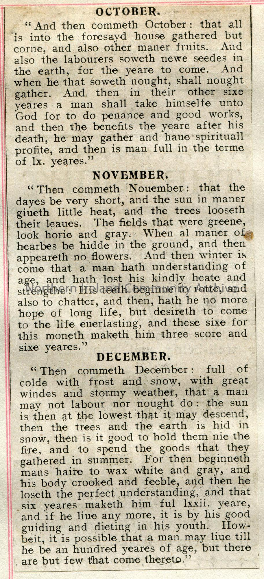 Article cut from a newspaper titled, ‘Kalendar of Shepherds: Being Devices for the Twelve Months’. The twelve months of the year depicting stages in l… – scan150b