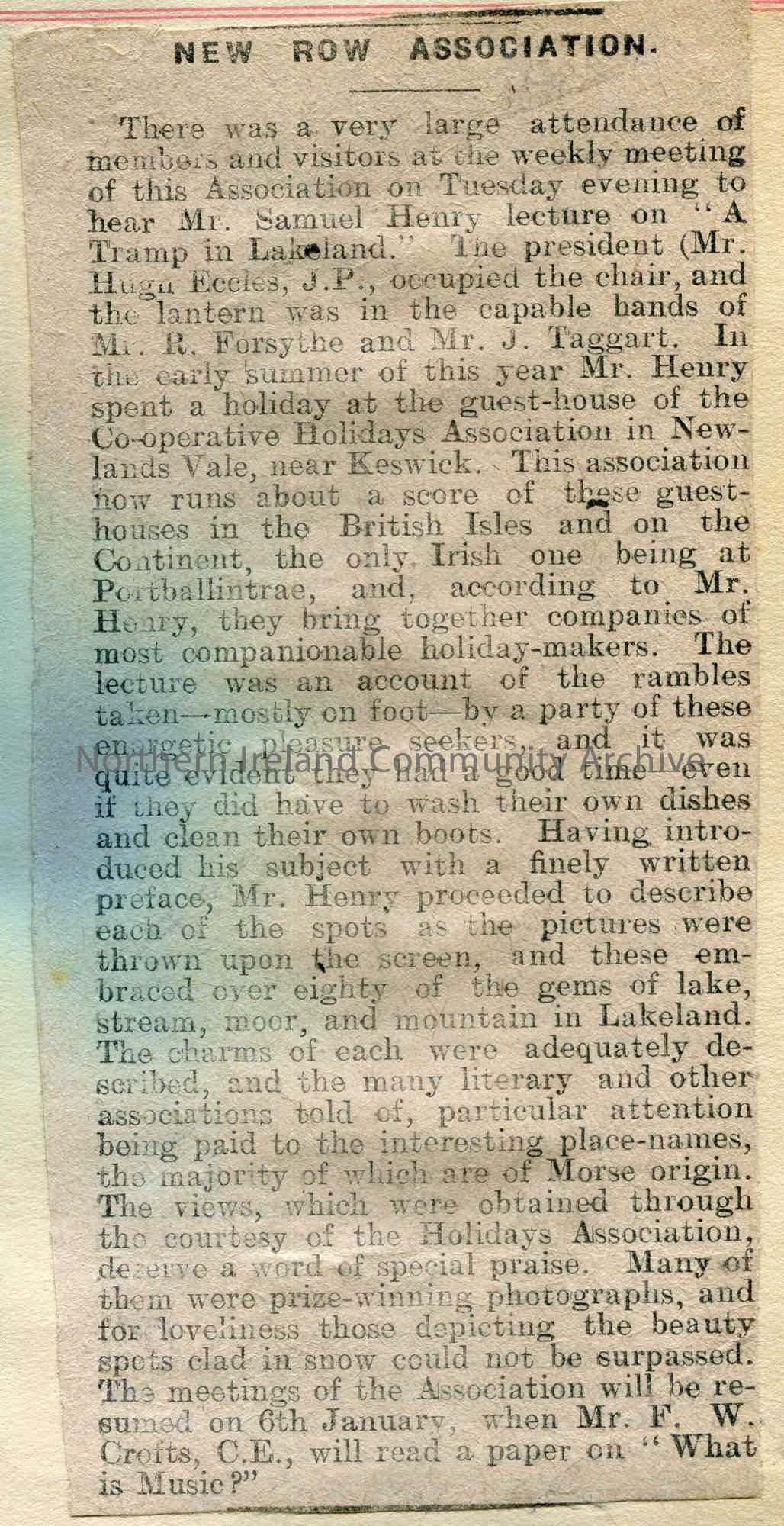 Article cut from a newspaper. Titled, 'New Row Association'. Dated 13th December 1913. Re Sam Henry's lecture at the Association's weekly meeting on 'A Tramp in Lakeland'. Re the ramblings of a party staying at a guest house of the Co-operative Holidays Association in Newlands Vale, Keswick.