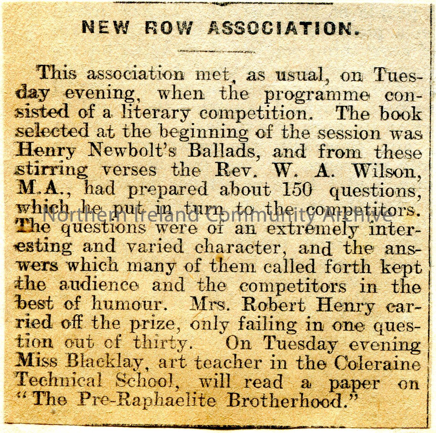 Article cut from a newspaper titled, 'New Row Association'. Re a literary competition held during a meeting of their Association. Mrs Robert Henry won the competition.