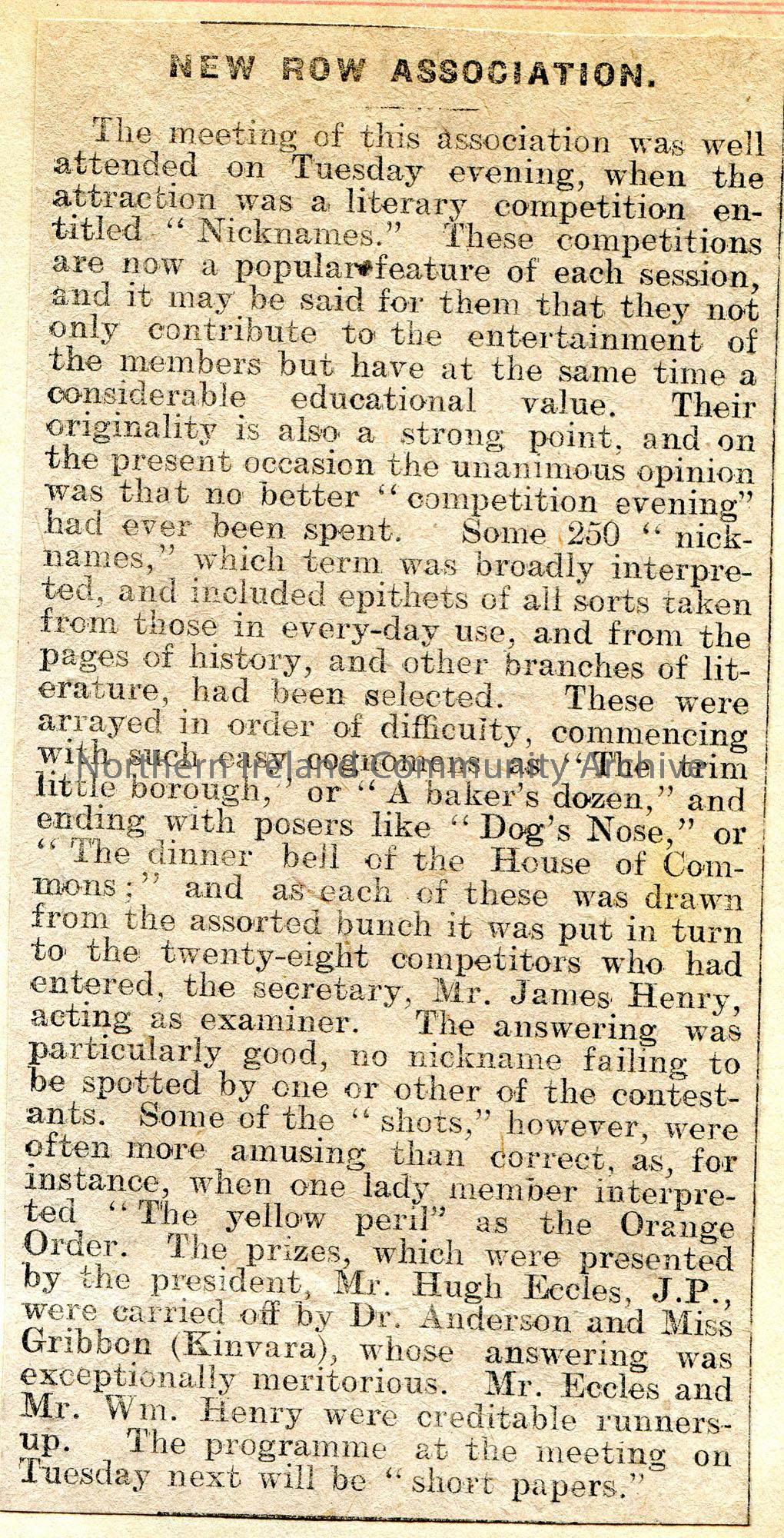 Article cut from a newspaper titled, 'New Row Association'. 'Session 1910-1911' handwritten in pencil at top of page. Re a literary competition on 'nicknames'. James Henry is mentioned as the Association Secretary. Winners noted as Dr Anderson and Miss Gribbon of Kinvarna. Runners up noted as Mr Eccles and Mr William Henry.