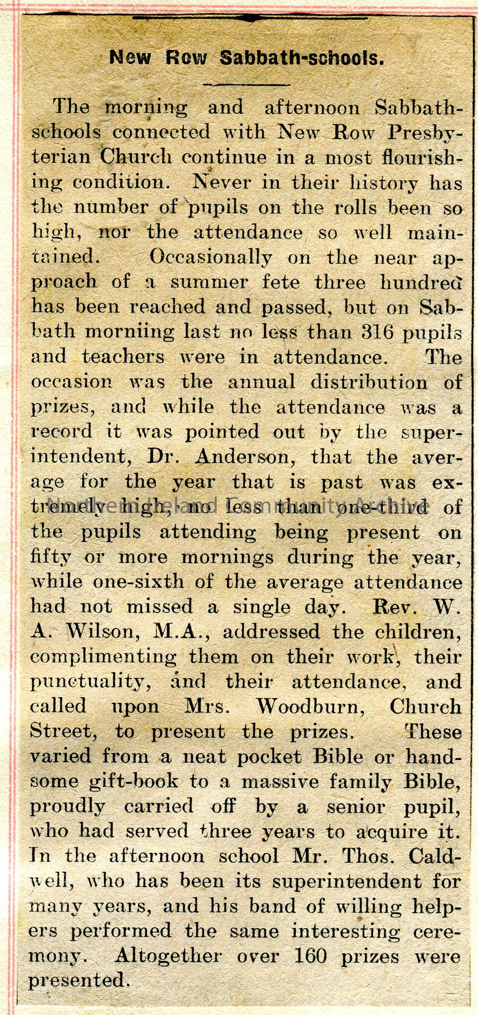 Article cut from a newspaper titled, 'New Row Sabbath-schools'. 'Jan 1911' handwritten in pencil above article on scrapbook page. Re the high attendance numbers to New Row morning and afternoon Sabbath schools. Gives details of a prize giving day to pupils. Mentions Dr Anderson, Rev. W. A. Wilson, Mrs Woodburn of Church Street and Mr Thomas Caldwell.