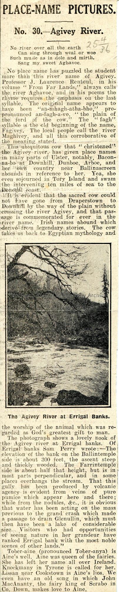 Article cut from a newspaper titled, 'Place-Name Pictures. No. 30. - Agivey River'. Looks into the origins of the name 'Agivey'. Photographic image captioned, 'The Agivery River at Errigal Banks' in centre of article.