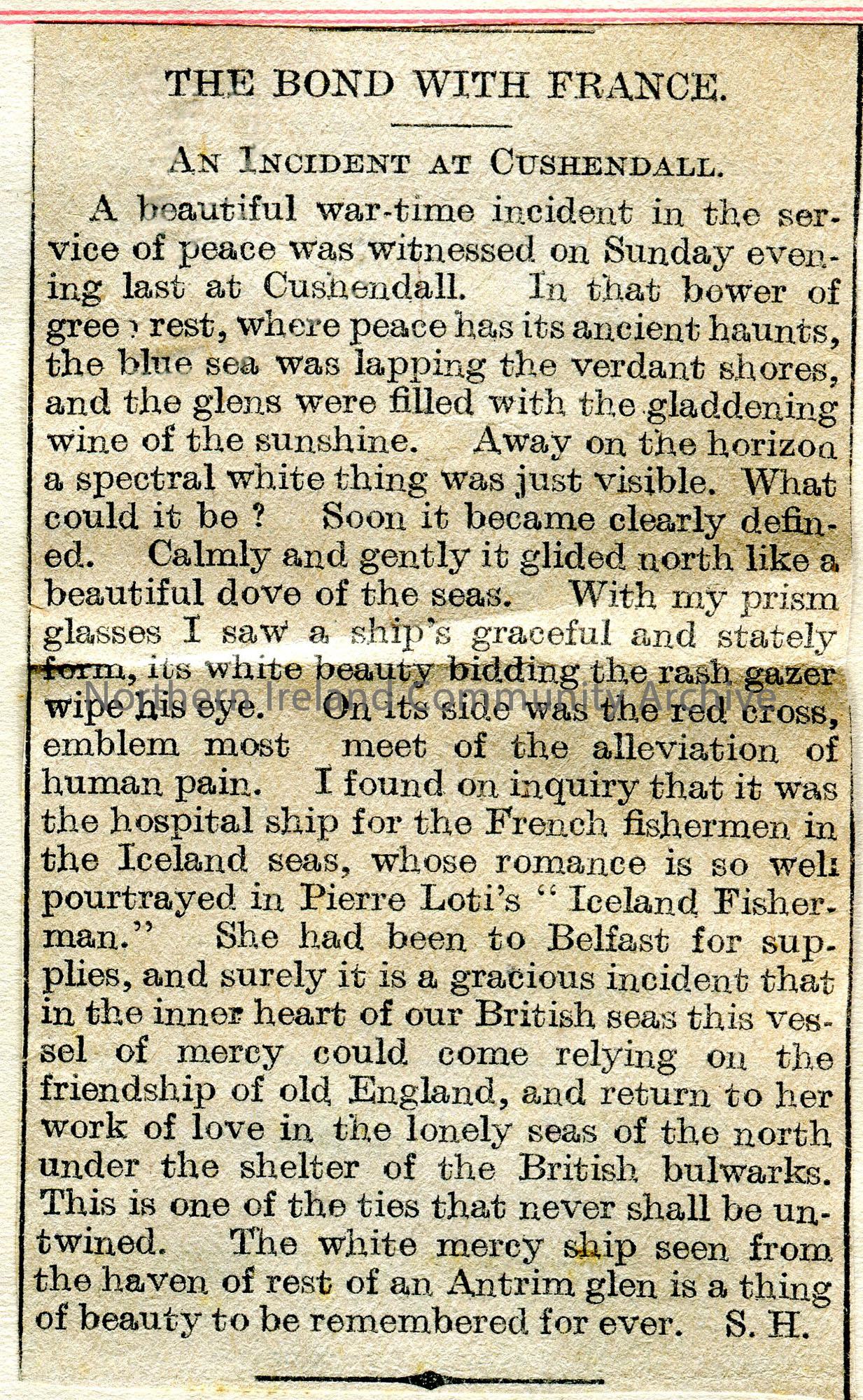 Article cut from a newspaper. Titled, 'The Bond With France. An Incident at Cushendall'. By Sam Henry. Sam recounts his spotting of a Red Cross hospital ship 'for the French fishermen in the Icelandic seas' having stopped at Belfast for supplies.