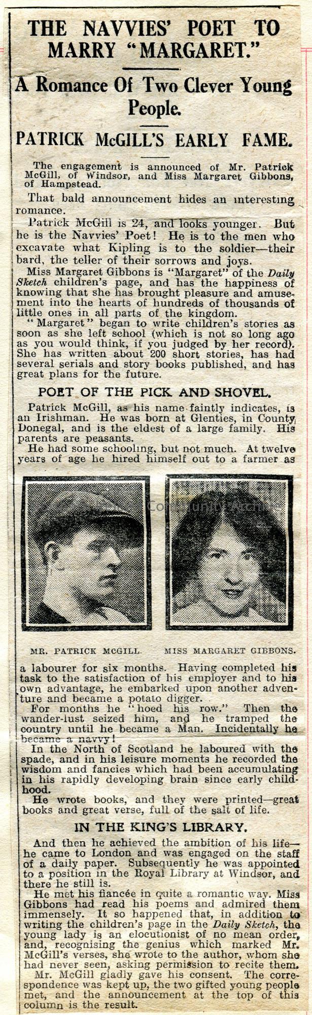 Article cut from a newspaper. Titled, 'The Navvies' Poet To Marry "Margaret". A Romance Of Two Clever Young People. Patrick McGill's Early Fame'. Features two photographic images of the couple.